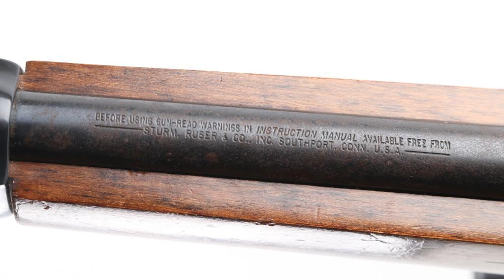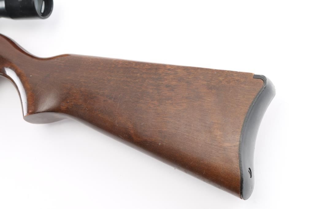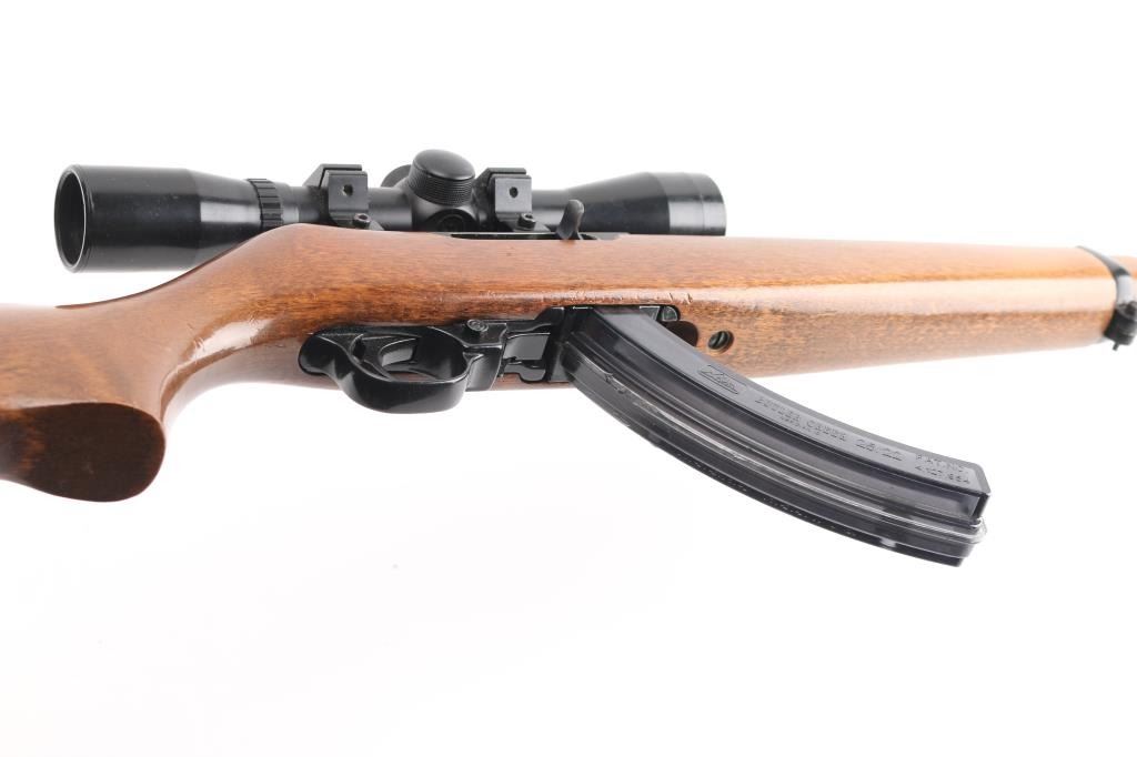 Semiautomatic rifle chambered for 22 LR. Features blued finish, smooth wood stock with curved grip, black plastic buttplate, 18" barrel, muzzle brake installed blade/bead front sight, folding adjustable rear sight, manual safety, manual bolt hold open, detachable Butler Creek 25 rd plastic magazine. Bore is excellent/bright. barrel is covered with spots of light surface rust & light pin prick pitting.. Stock is good/sound overall with minor scratches/dings mounted with a BSA scope, Comes with extra BC 25 rd magazine, 2 total. Condition is NRA Fair. Modern Firearm.