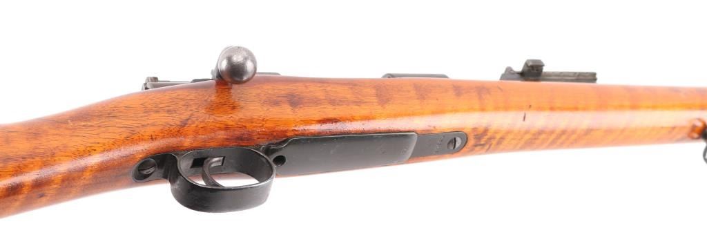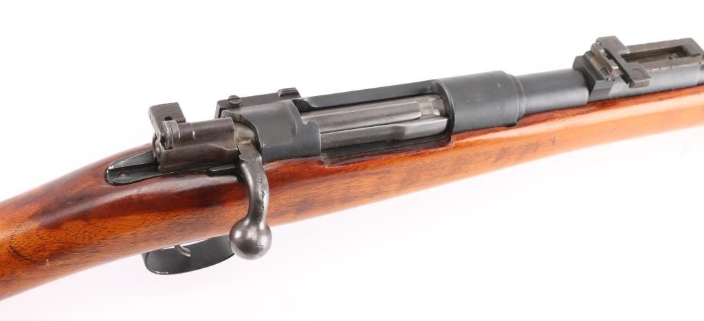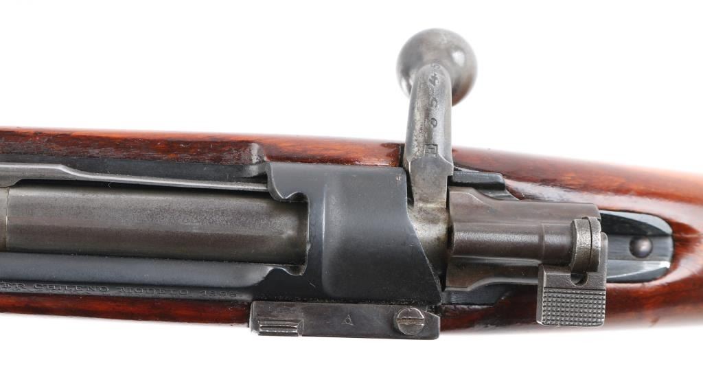 Chilean military rifle made by Ludwig Lowe, Berlin Germany that has been sporterized, Features a shortened 22" barrel, sling swivels, manual safety, military style sights, modified stock. matching serial numbers, turned down bolt handle. Bore is fair to good, with frosting in the grooves, strong rifling. Retains 95% blue. Bolt is polished. Shortened stock is good condition with minor small dents and nicks. Faint Chilean crest and on receiver. No import marks observed. NRA Condition-Very Good as Sporterized. Antique Firearm.