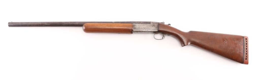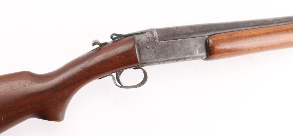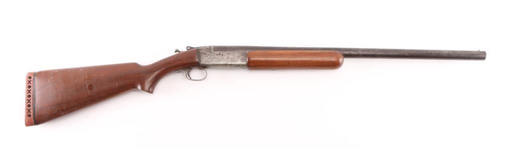 Single shot break open shotgun for 2-3/4" shells. Features shortened 24" barrel, steel front bead, manual cocking button. Smooth wood forend & semi-pistol grip shoulder stock with Western Field buttplate. Bore is very good condition, choke measures IC. Metal shows full coverage of a fading finish, now mostly brown or gray, with edge losses. Stock is good or better condition with minor scratches. The exposed hammer spur has been repaired with braised metal. NRA Condition-Fair. C&R Firearm.