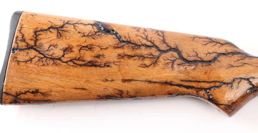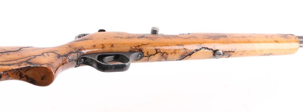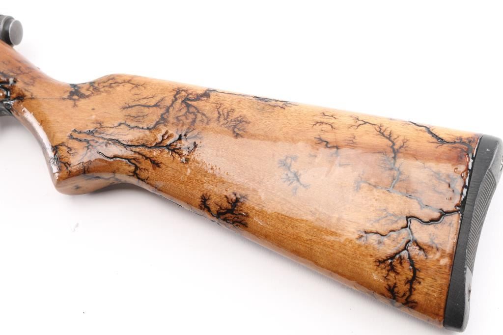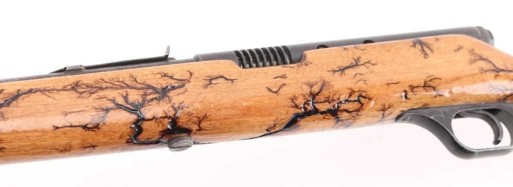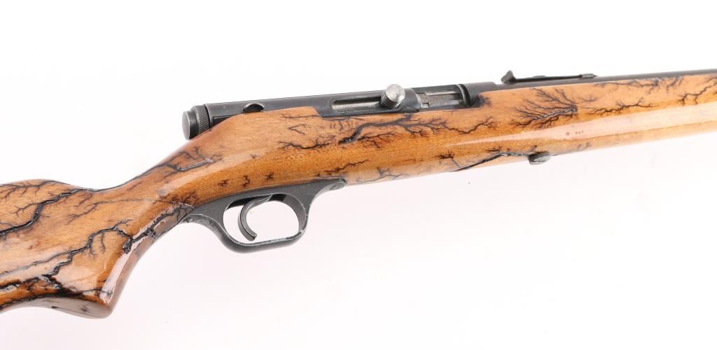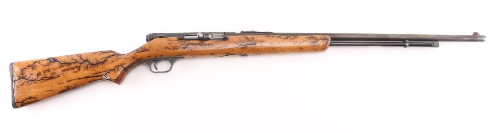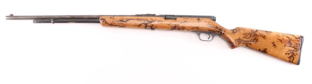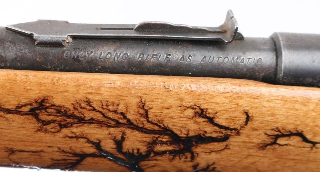 Vintage semi-automatic sporting rifle chambered in .22 S/L/LR (.22 Long Rifle only as automatic). It has a 24" blued barrel and receiver with a dovetailed blade/bead front sight, adjustable rear sight, 3/4 length magazine tube, serrated trigger and a cylindrical charging handle that pushes inward to lock the bolt open or closed with a thumb safety on the top right. It sits in a one piece, straight grain wood stock with a black plastic butt plate. Blue metal finish looks faded with handling wear. The plain wood stock show a repaired crack in the wrist , has a black 'tree branch' design Bore looks very good, bright. Condition is NRA Good. C&R Firearm.