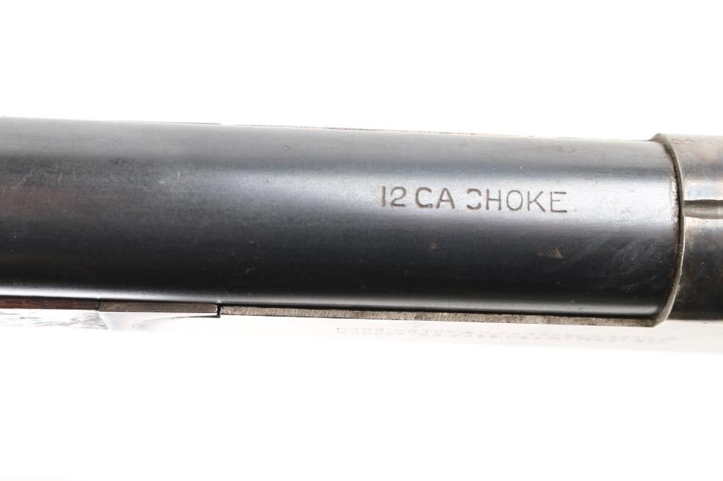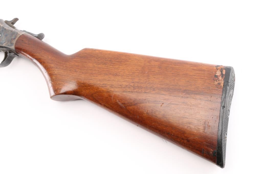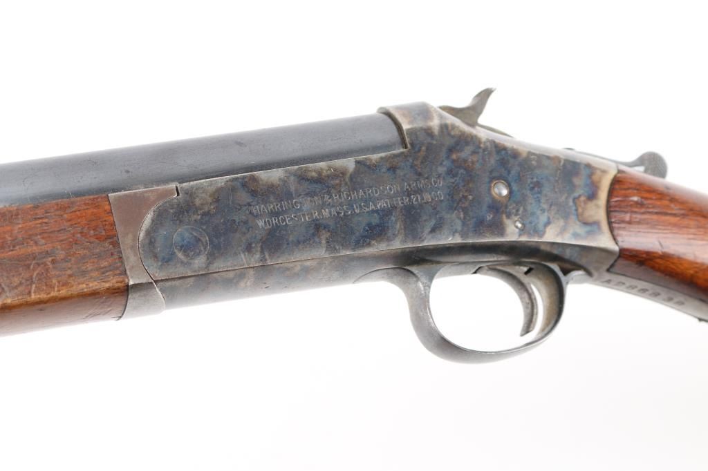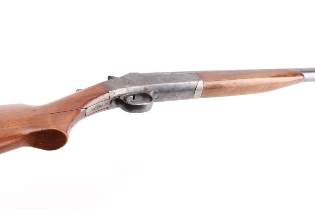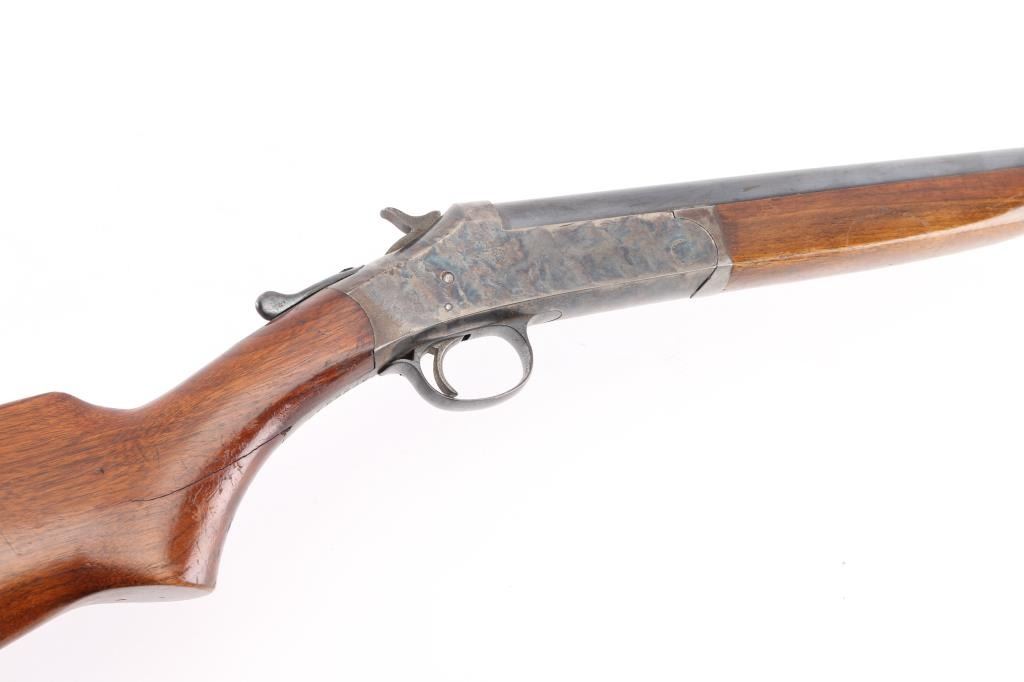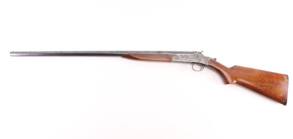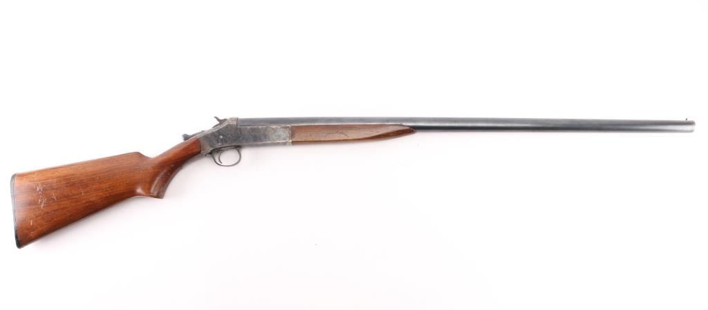SN: A286838 Older style Single shot exposed hammer shotgun in 12 gauge. Blued finish, case hardened receiver, smooth wood semi-pistol grip stock with black checkered plastic butt plate with H&R emblem, short smooth wood forearm, 30" barrel with brass bead front sight, LOP 14 1/4", very good bore but a little dirty. Retains 96% of it's blue finish with some shallow scratches and dings throughout the wood. Some edge wear on the end of the barrel and scrapes on top left end of stock. Condition is NRA Very Good. Modern Firearm.