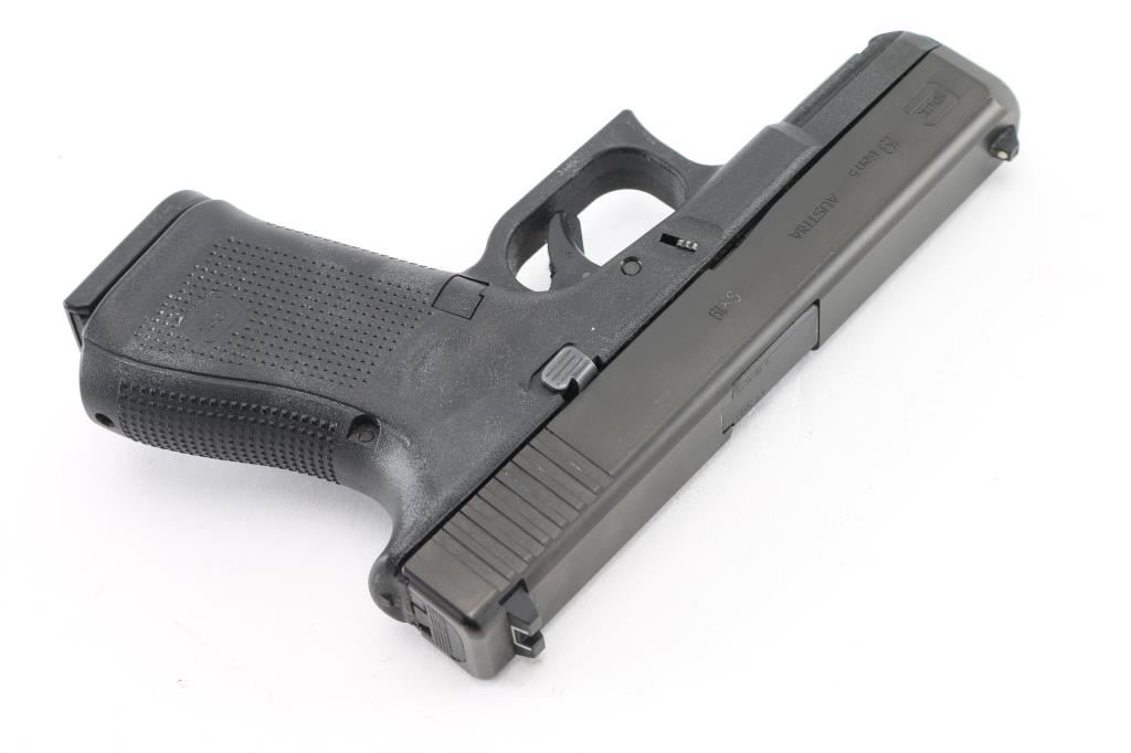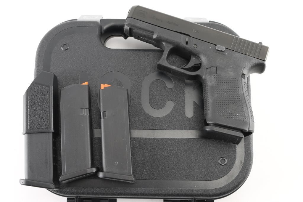 Austrian semiautomatic pistol, imported by Glock Inc, Smyrna GA. Features approx 4" barrel, fixed sights with white dot front & white outline rear, striker fired, manual safety in trigger, replaceable backstrap inserts with different size & shape, accessory rail on dust cover. All black finish. Mag catch changed to left hand side. Numbers match on slide, barrel, frame. Bore is excellent condition. Overall external condition is like new, with little evidence of handling. Includes original "Red Label" factory plastic carry case, manual, cleaning rod & brush, four 15 round magazines, mag loader, four different backstrap inserts. Condition is NRA Excellent - like new *** Modern Firearm ***