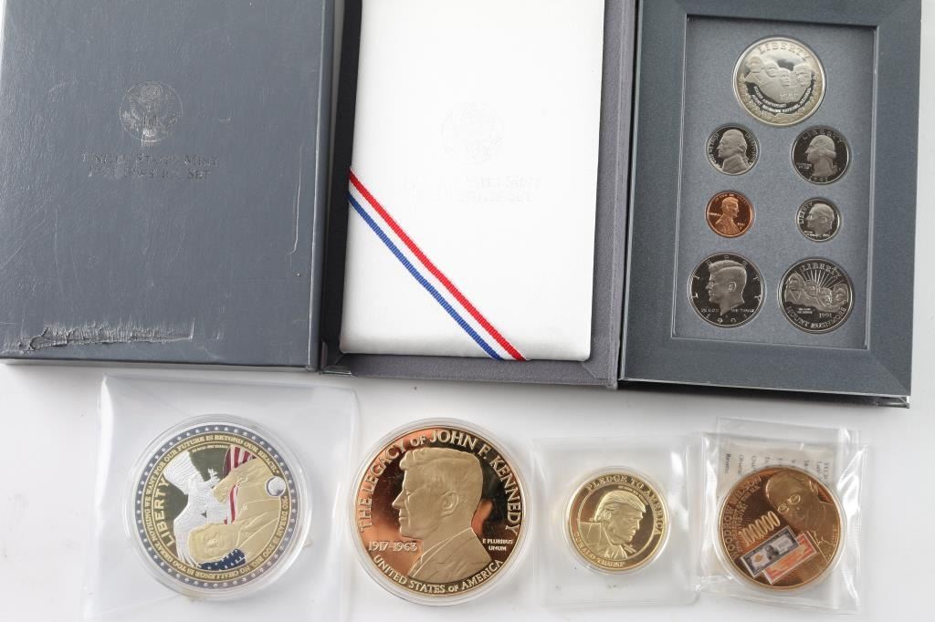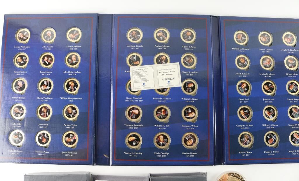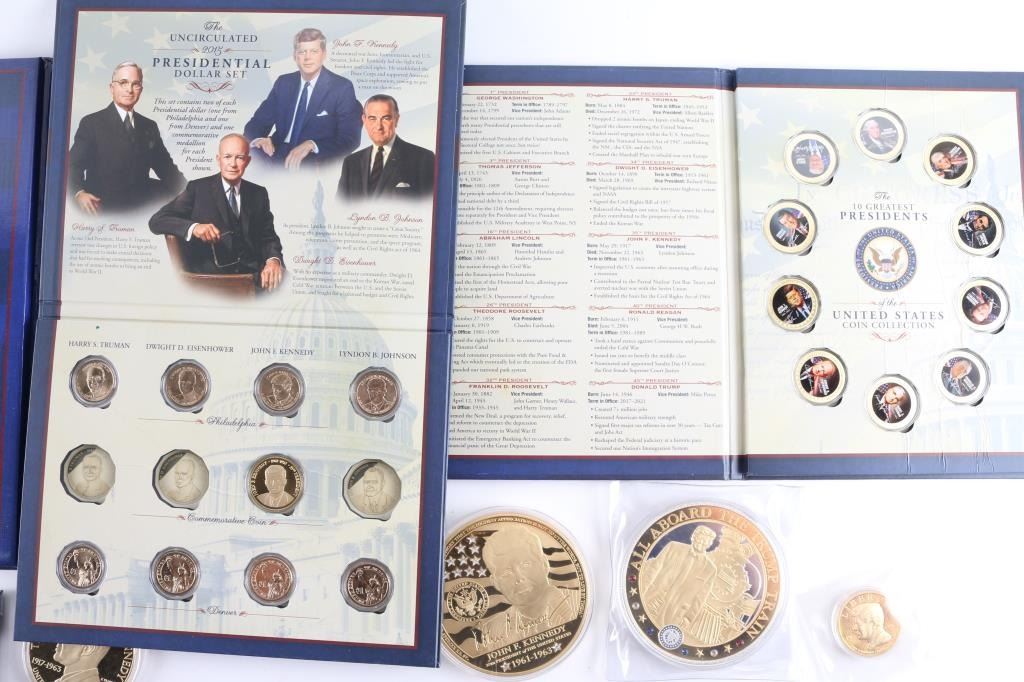 Here we have, from American Mint, a collection of commemoratives in various sizes, mostly copper with silver and or gold layering, including 1) The Complete Collection of U.S. Presidents. 2) The 10 Greatest Presidents of the United States. 3 The Uncirculated 2015 Presidential Dollar Set, (missing 3 coins). 4) a single Woodrow Wilson gold note. 5) Three different size John F. Kennedy coins. 6) Three different size Donald Trump coins and 7) the United States Mint 1991 Prestige Set. All of these are in very good to excellent condition. Nice way to either start a collection, or finish one. This is a steal.