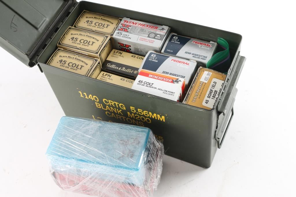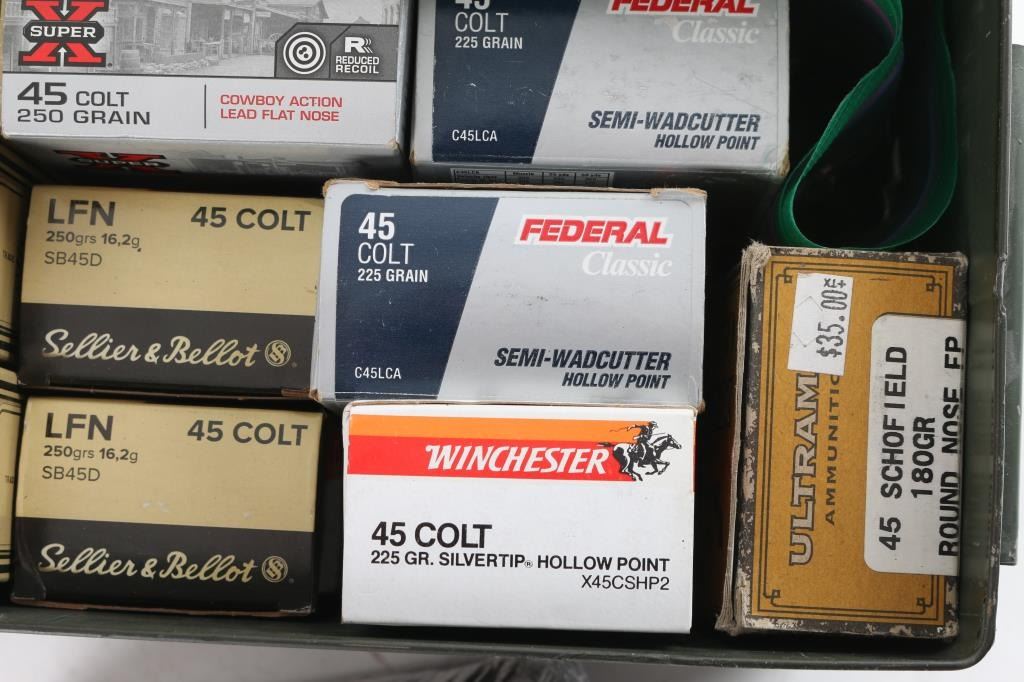 Approx. 450 rounds of .45 Colt and approx. 200 rounds of .45 Schofield ammo, miscellaneous brands, new in factory boxes.