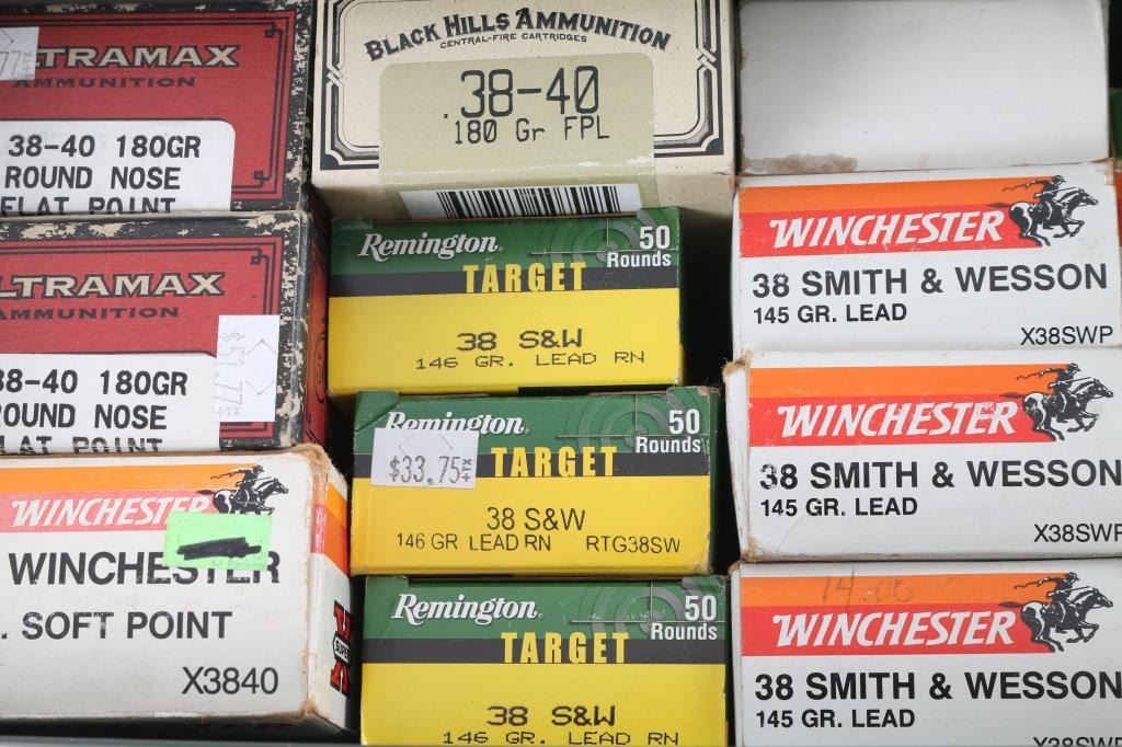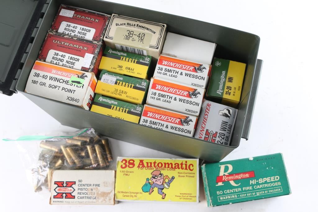 Approx. 150 rounds of factory 32-20, approx. 220 rounds of factory 38-40, approx. 300 rounds 38 S&W and approx. 100 rounds of 38 Auto. All in factory boxes.