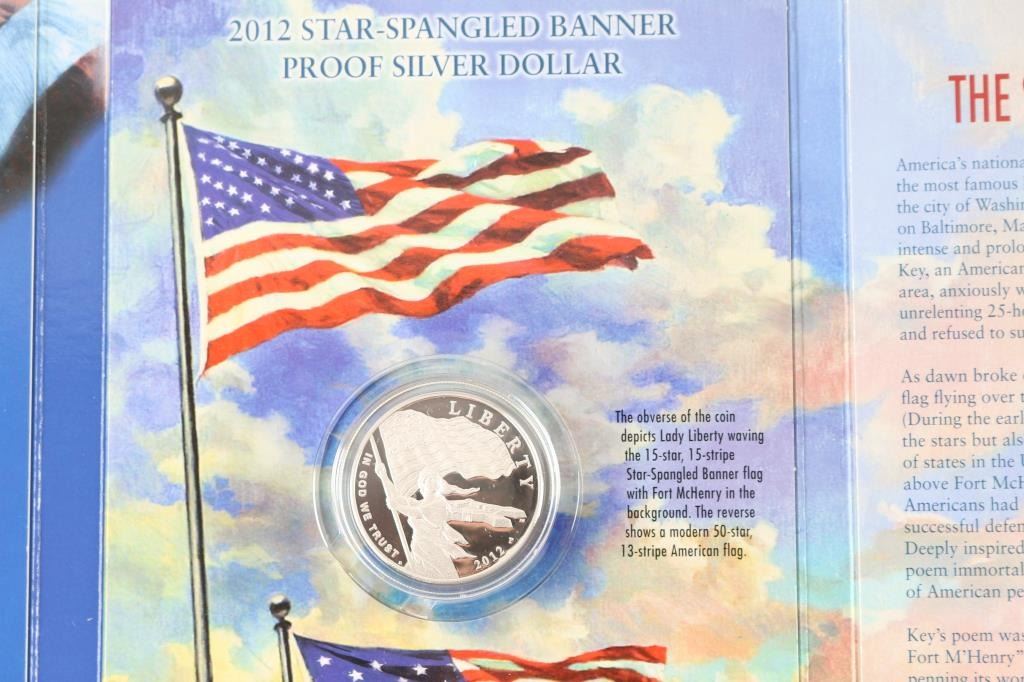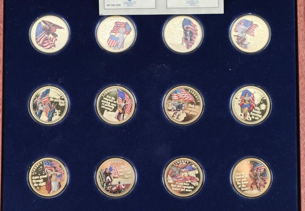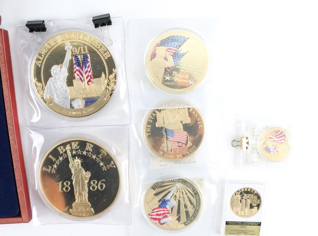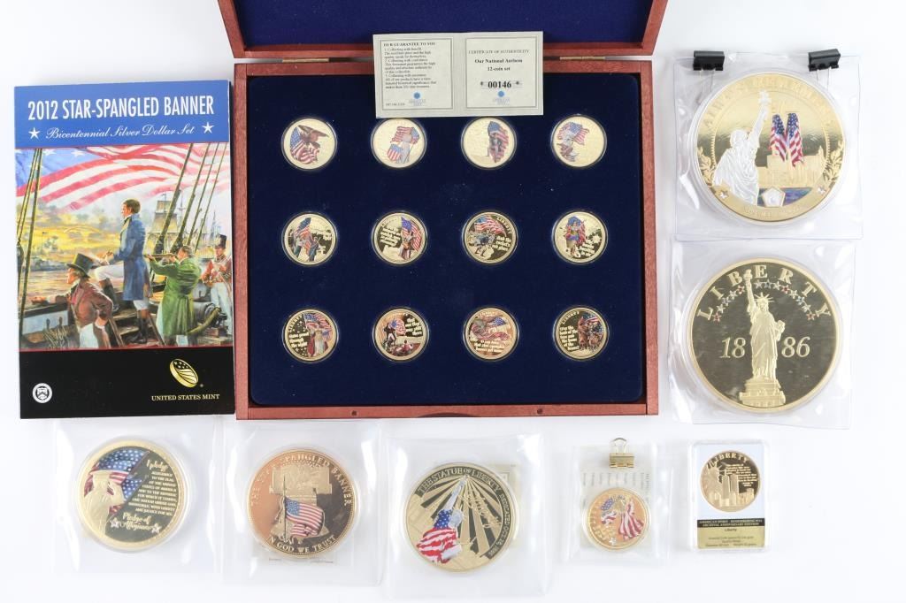 Here we have, from American Mint, a collection of commemoratives in various sizes, mostly copper with silver and or gold layering, including 1) The 2021 wood cased The Star-Spangled Banner set. 2) Dawn's Early Light. 3) The Star-Spangled Banner Eagle. 4) Pledge of Allegiance. 5) The Statue of Liberty. 6) Liberty 1886. 7) Always Remember. 8) American Spirit - Remembering 9/11 and 9) From the U.S. Mint the 2012 Star-Spangled Banner Bicentennial Silver Dollar Set. All of these are in very good to excellent condition. Nice way to either start a collection, or finish one. This is a steal.