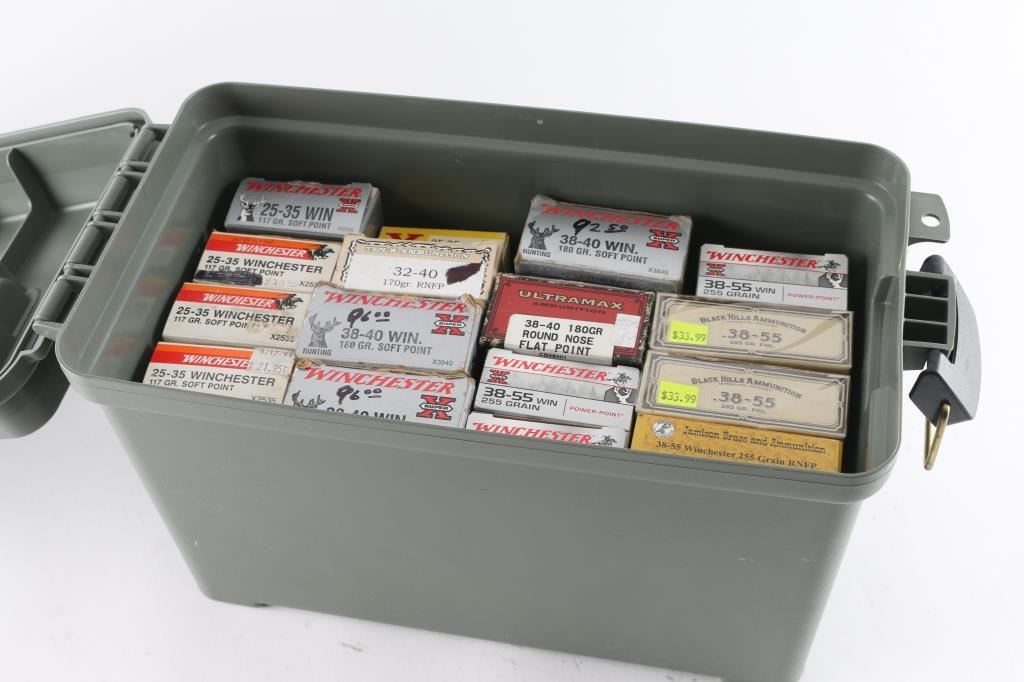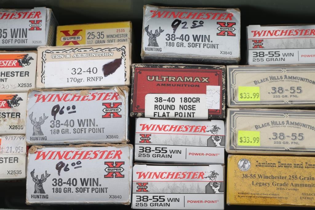 Approx. 95 rounds of 25-35, approx. 20 rounds of 32-40, approx. 200 rounds of 38-40, approx. 120 rounds of 38-55. All new in factory boxes.