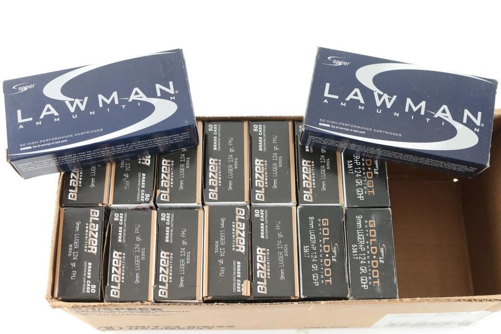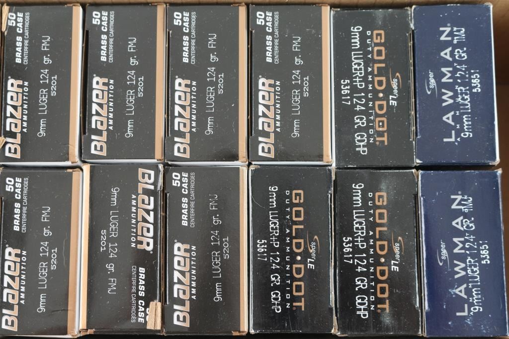 mixed types. Includes 550 rds Blazer 124gr FMJ, 150 rds Gold Dot 124gr GDHP, 100 rds Lawman 124 gr TMJ. All in factory boxes.