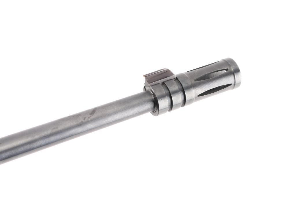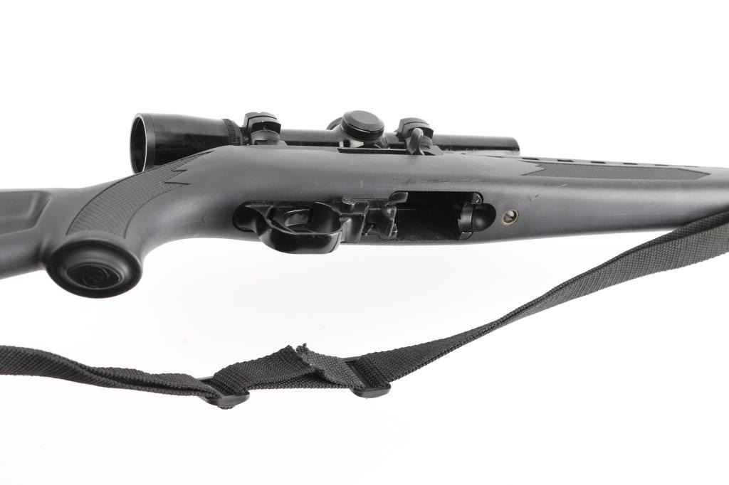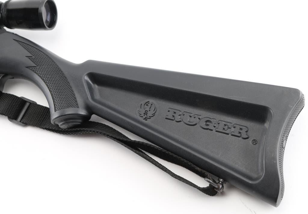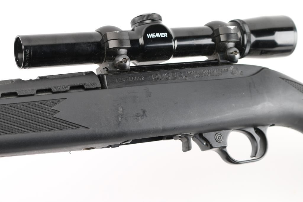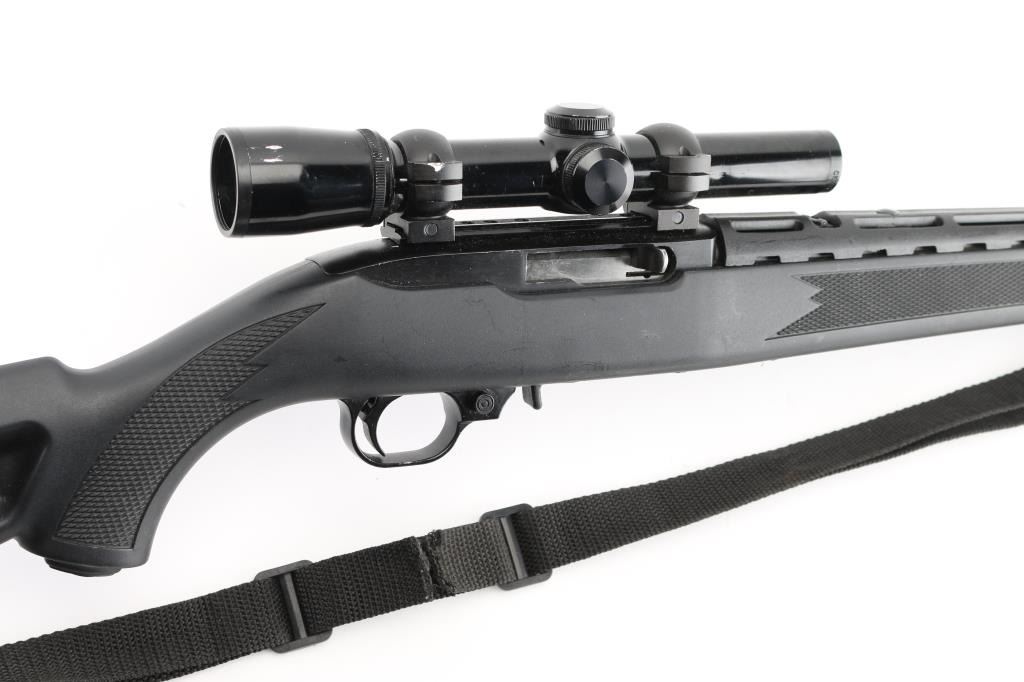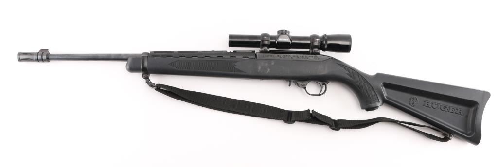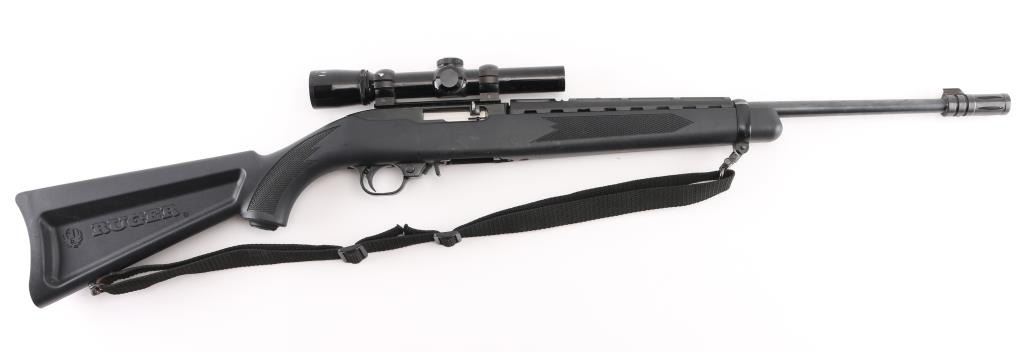 American made semi-automatic rifle chambered in .22LR. 18" barrel, bird cage muzzle brake with blade front sight, no rear sight, scalloped dovetails on receiver for scope mounting, push button manual safety and lever box magazine release. Ruger black polymer "boat paddle" stock with checkered forend & grip. Black polymer vented upper forearm, Bore is excellent. Synthetic stock is excellent. Comes with Weaver 2.5 X 7 compact scope and black nylon sling. Condition is NRA Excellent. Modern Firearm.