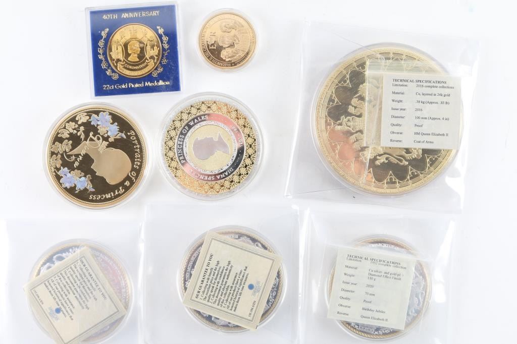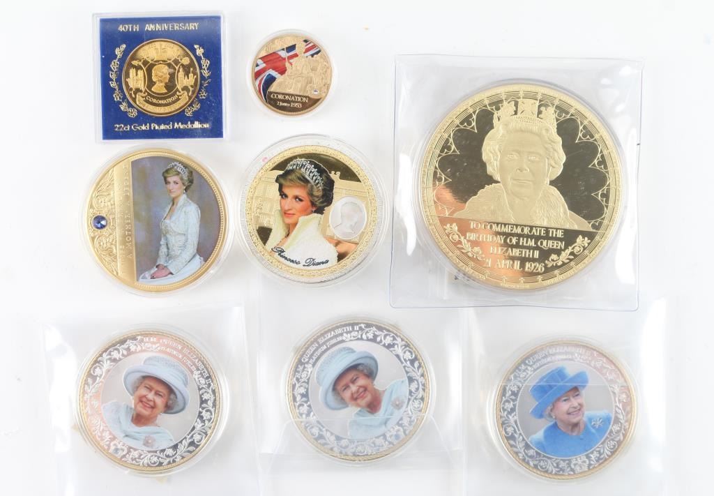 Here we have, from American Mint, a collection of commemoratives in various sizes, mostly copper with silver and or gold layering, including 1) Queen Elizabeth II. 2) Queen Elizabeth II Birthday Jubilee. 3) Two, Queen Elizabeth II Platinum Jubilee. 4) Elizabeth II Coronation. 5) In Memory of Princess Diana. 6) Princess Diana Portraits of a Princess. All of these are in very good to excellent condition. Nice way to either start a collection, or finish one. This is a steal.