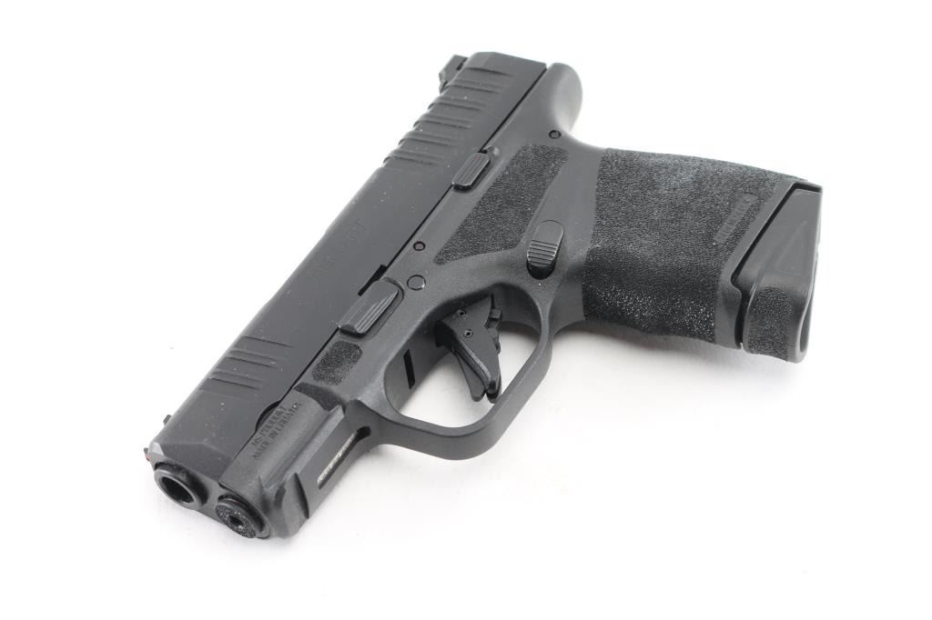 Croatian semiautomatic pistol imported by Springfield Armory, Geneseo IL. Features 3" barrel, fixed sights in dovetails, red dot fiber optic front sight, white outline "U" shaped rear sight, striker fired, manual safety in trigger, loaded chamber indication, accessory rail on dust cover. All black finish; polymer frame. Bore is excellent condition. Overall external condition is like new, with little evidence of handling. Includes Springfield Armory black nylon zipper pouch, (2) magazines, left handed kydex holster, factory box. Condition is NRA Excellent - like new *** Modern Firearm ***