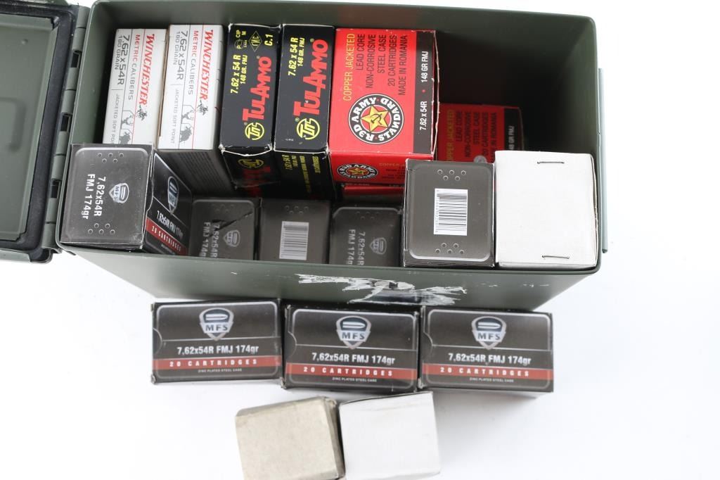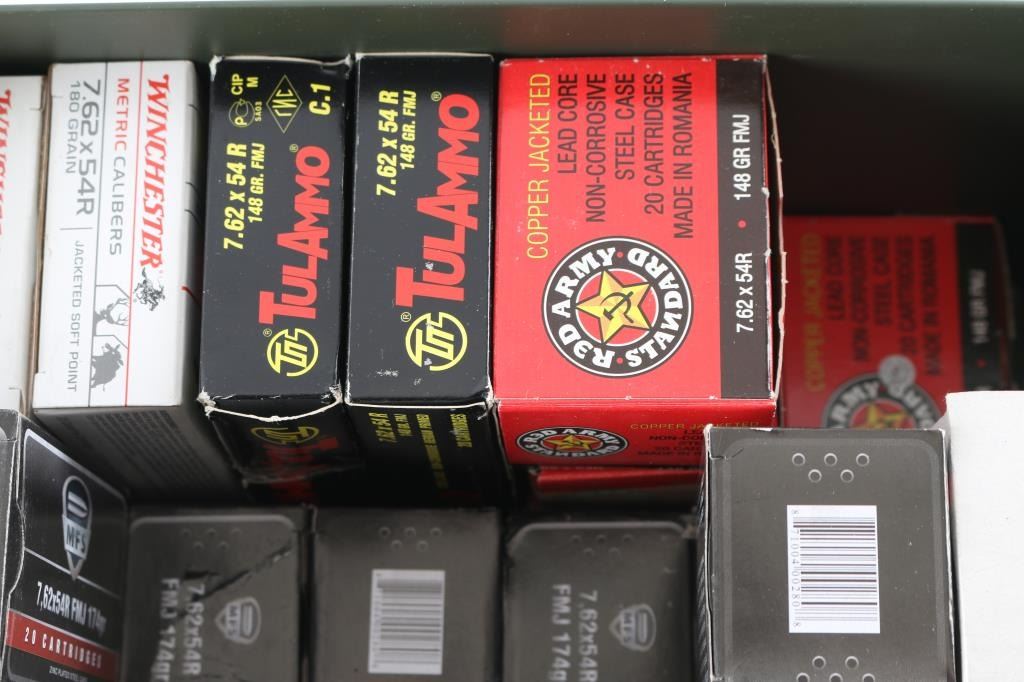 includes MFS, Tulammo, Red Army Standard, Winchester. Approx 360 rounds in factory boxes. Also approx 100 blanks, and approx 15 stripper clips for Mosin Nagant rifles.