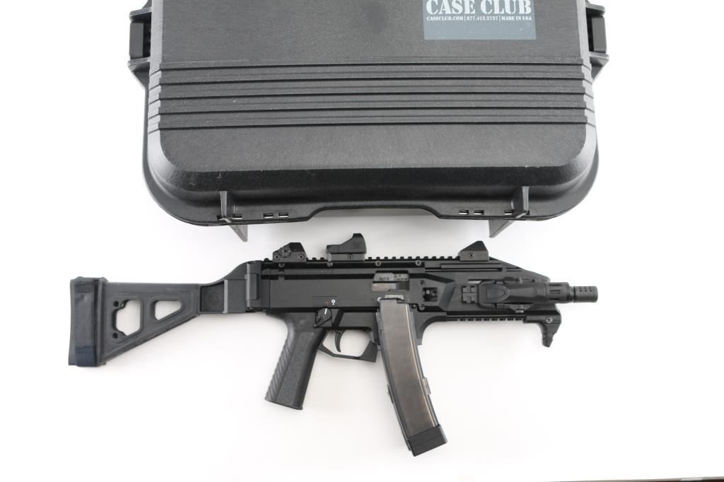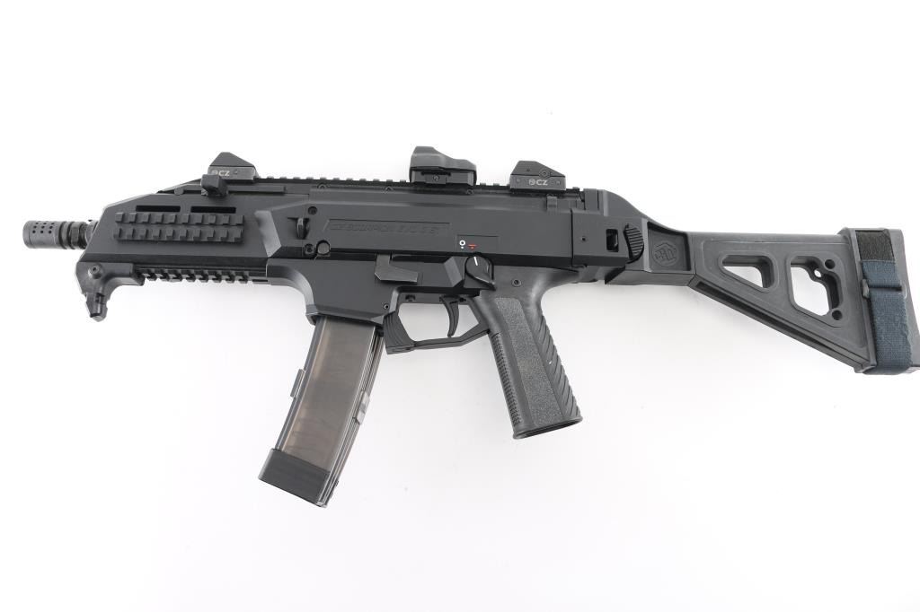 Czech Semiautomatic pistol imported by CZ-USA. Features matte black finish, polymer construction, 7.75" barrel, muzzle brake, Picatinny rail sections on forend and along receiver top, back up iron sights, Vortex Viper red dot sight, ambi safety, side folding pistol brace. A hand stop and Inforce flashlight have been mounted to the forend. Condition is like new with handling marks. Includes Case Club foam lined hard case (7) 30 rd & (2) 15 rd magazines, extra (different style) brace, mag loading tool, Condition is NRA Excellent *** Modern Firearm ***