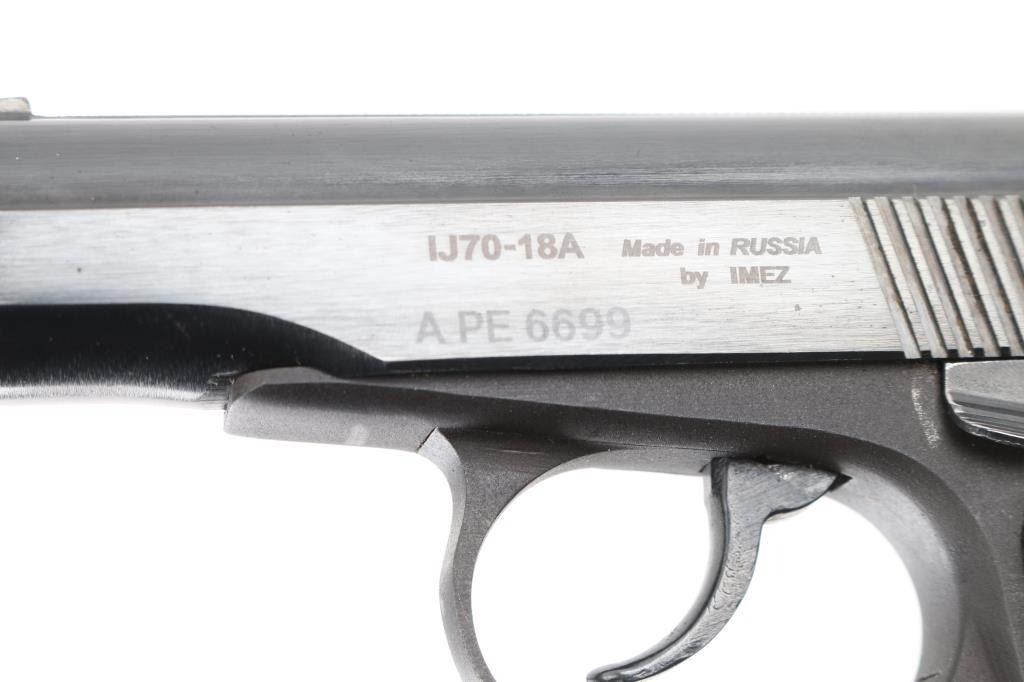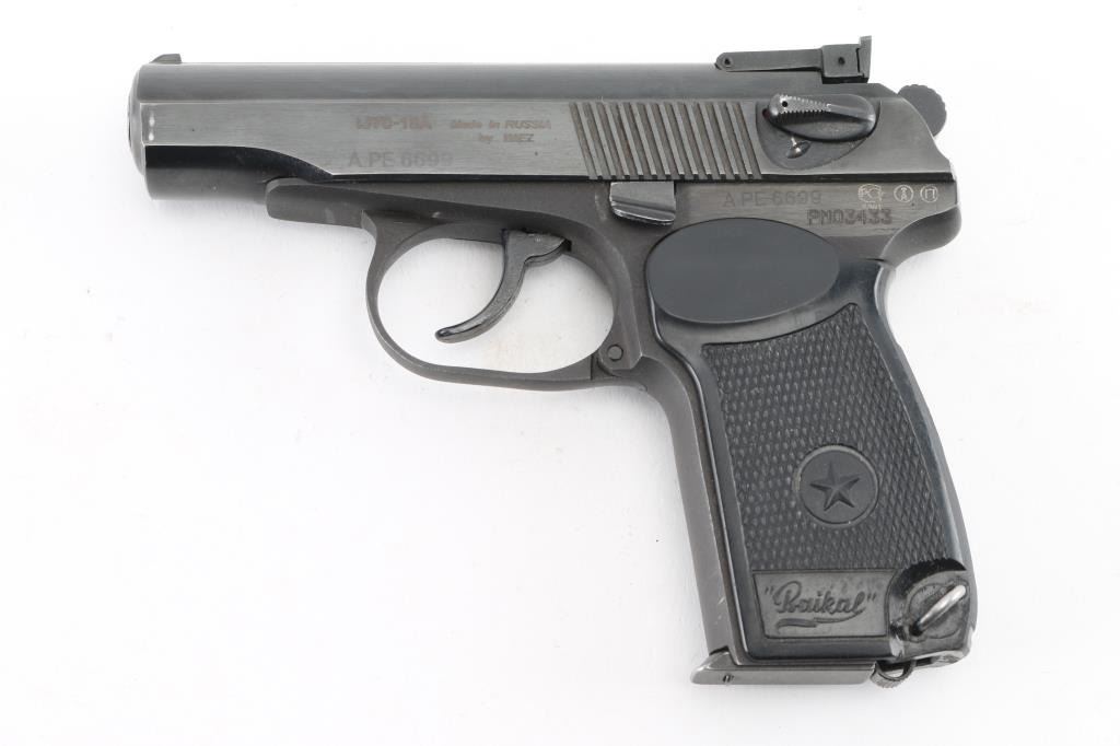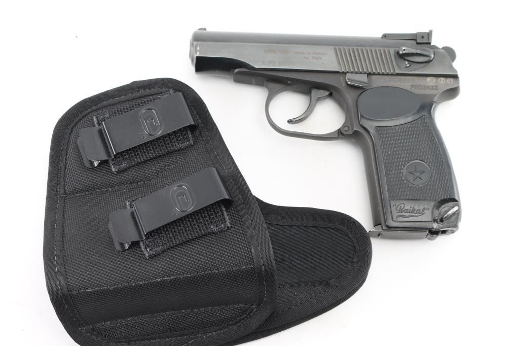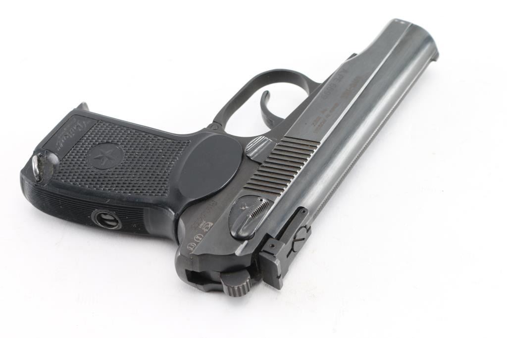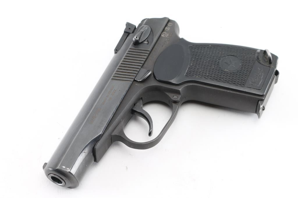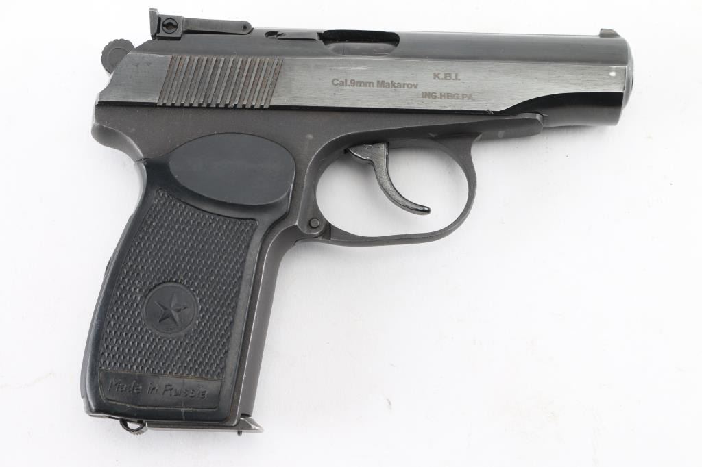 Semi-Automatic. 8+1 Capacity. "Makarov" Russian Made. Produced 1949-Present. Standard Military/Police sidearm of the Soviet Union. Commercial version. Blowback action. 3.68" barrel. Front blade and drift adjustable notch rear sights. Slide mounted thumb safety, Imported by K.B.I. (Right slide) Blued metal slide. Parkerized frame. One-piece checkered/serrated black plastic grips with Russian star. Lanyard ring. Bore is excellent/bright. Blue finish is about 95% with some edge wear, scratches & minor rust. Slide action is smooth/tight. Grips are very good. Comes with one 8-rd magazine . Comes with a black nylon IWB holster. NRA Condition is Good