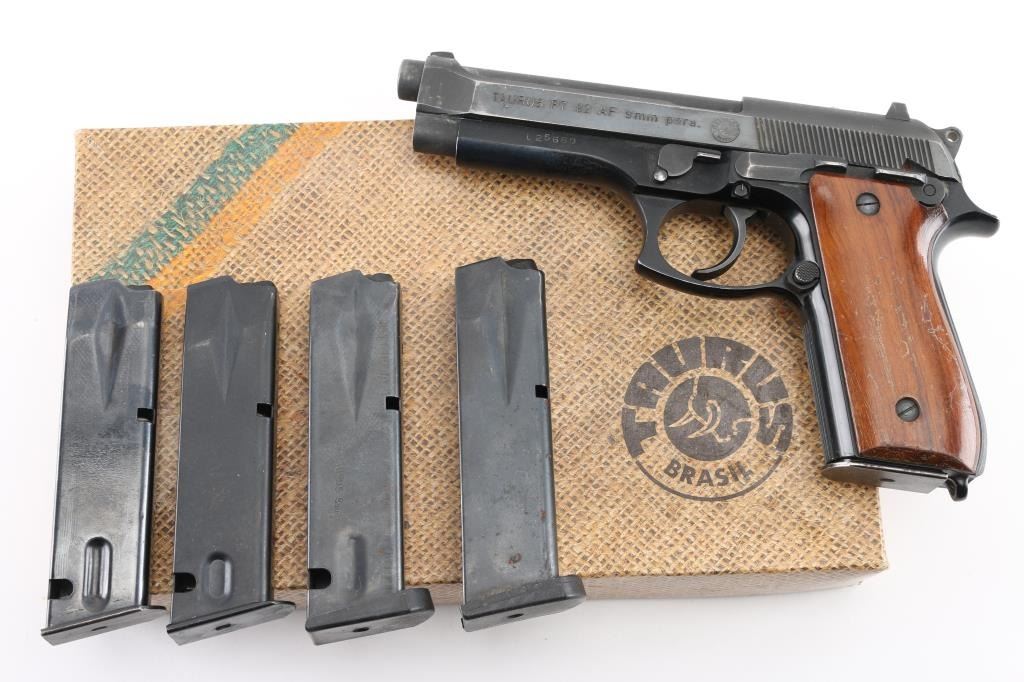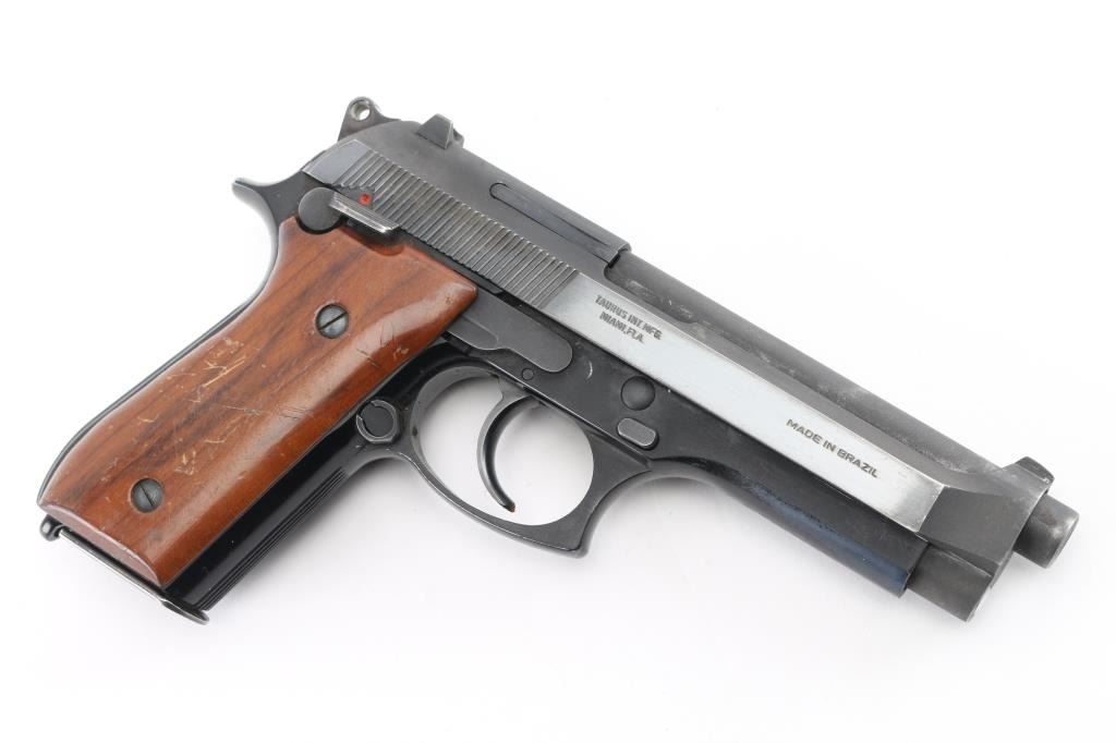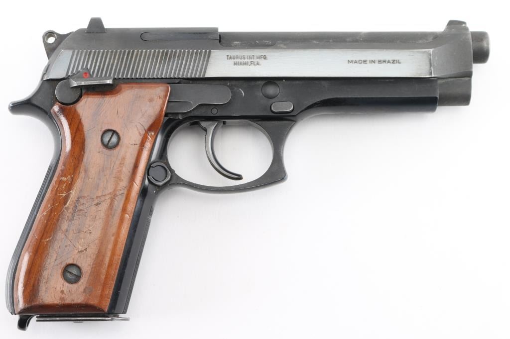 Semi-automatic pistol made in Brazil, imported by Taurus International, Miami FL. Features blued finish, black anodized alloy frame, 4.75" barrel, fixed sights, open top slide, manual safety on both sides of frame, smooth wood grips, lanyard stud at butt. Bore is excellent. Metal retains 80% finish with moderate holster wear, handling marks, rubbing on barrel from slide travel. Includes total of five magazines, factory cardboard box. Condition is NRA Very Good. *** Modern Firearm ***