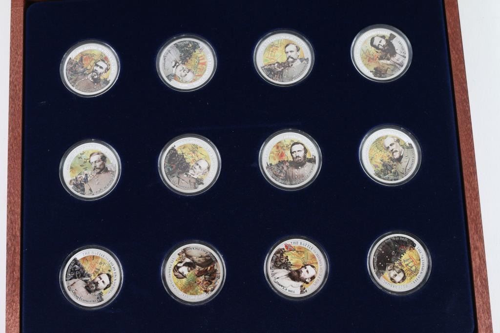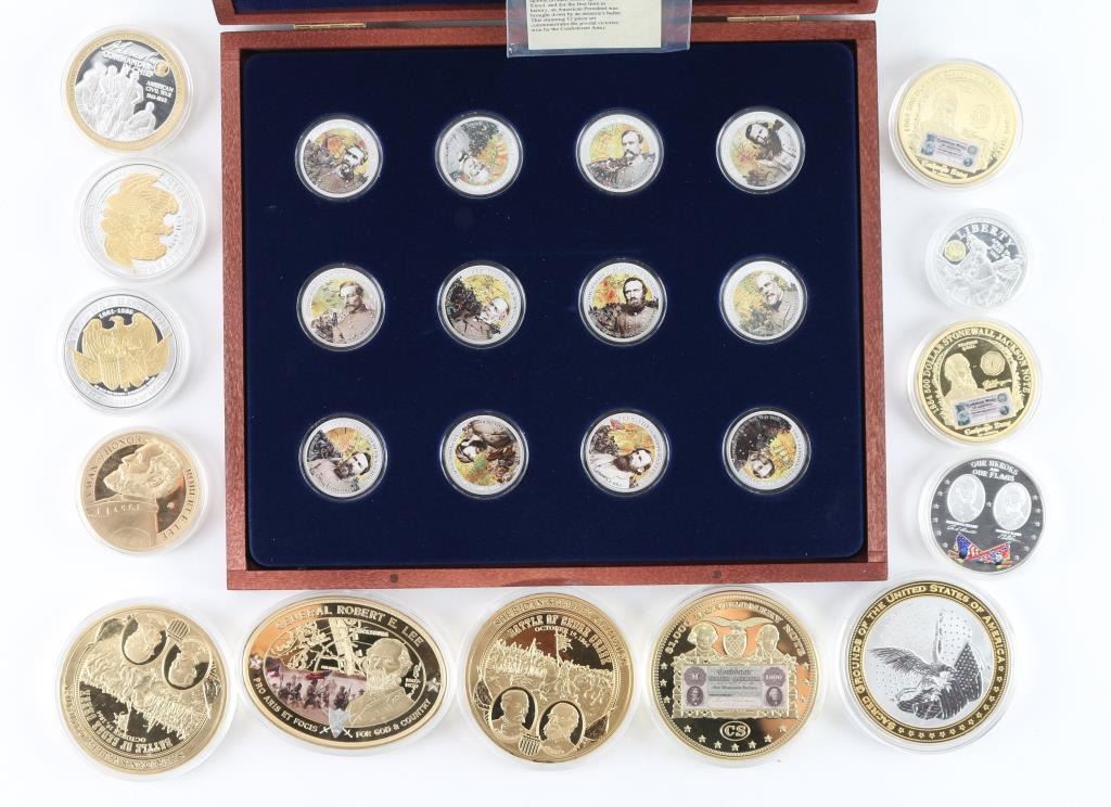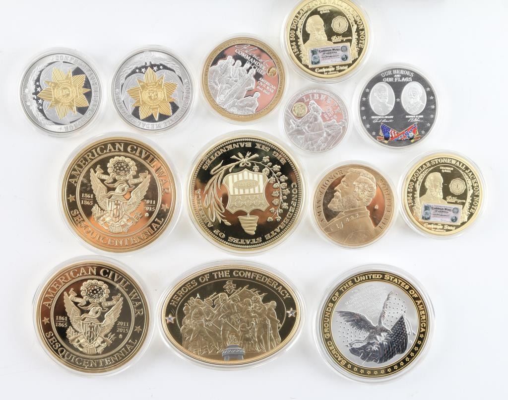 Here we have, from American Mint, a collection of commemoratives in various sizes, mostly copper with silver and or gold layering, including 1) Victories of the Civil War (Confederate Victories) a 12 piece set. 2) Battle of Gettysburg. 3) Robert E. Lee. 4) Robert E. Lee Command. 5) T-1 $1,000 Montgomery Note. 6) Two, Sheridan's Valley Campaign, Battle of Cedar Creek. 7) Two, Confederate Medal of Honor. 8) The Battle of Chancellorsville. 9) Two, 1864 $500 Jackson Notes. 10) Our Heroes and Our Flags and 11) Abraham Lincoln Commander In-Chief. All of these are in very good to excellent condition. Nice way to either start a collection, or finish one. This is a steal.