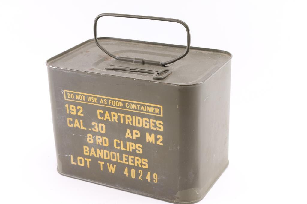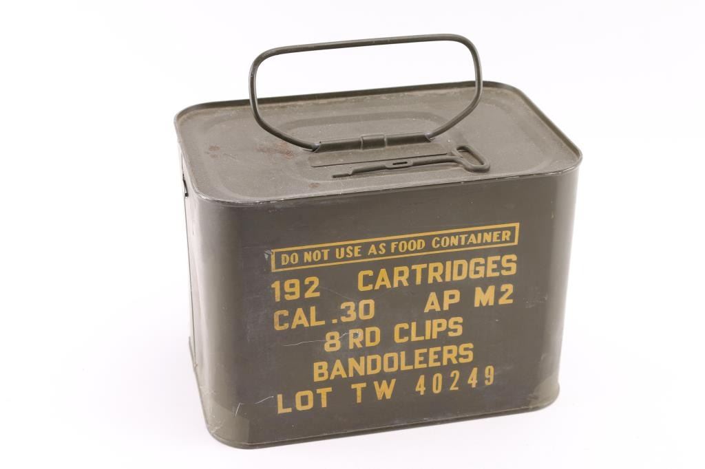 Unopened USGI "Spam Can" of 192 AP M2 .30-06 cartridges in 8 rd clips/Bandoleers.