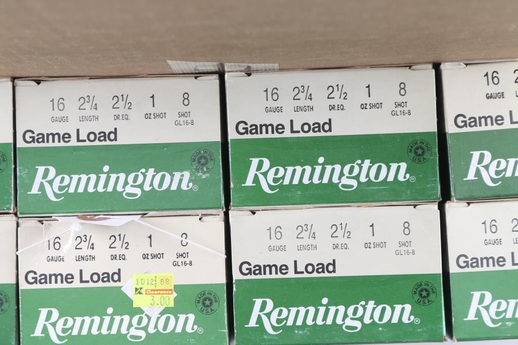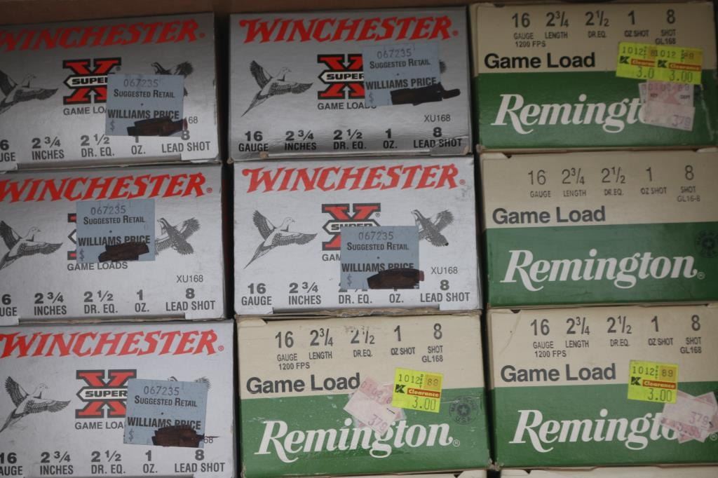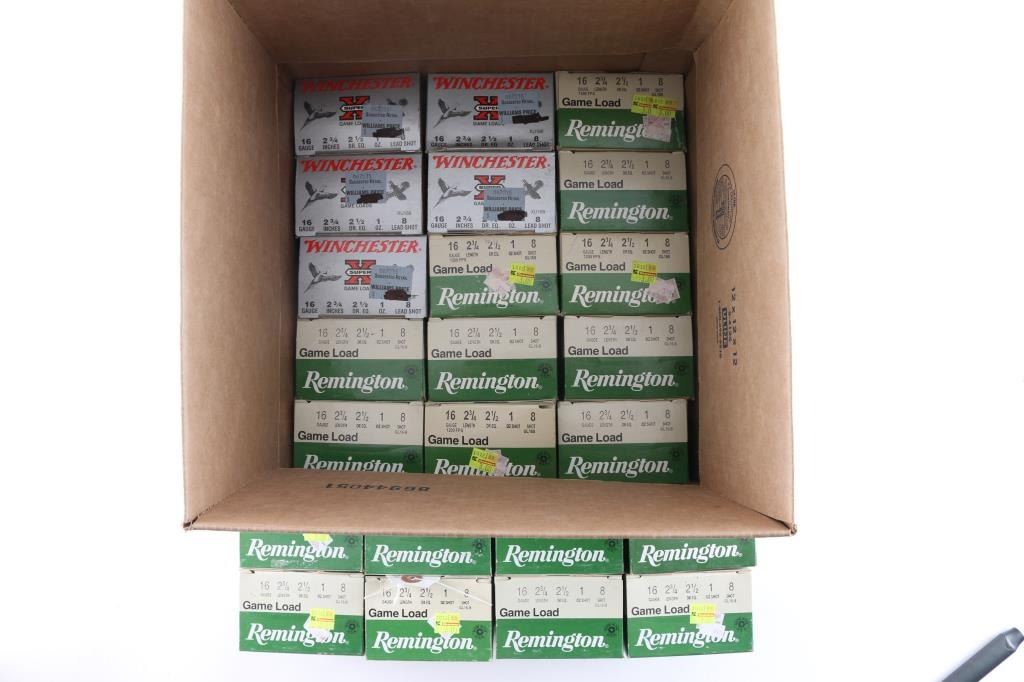 Approx. 550 rounds of 16 Gauge shotgun shells, all new from Remington to Winchester, various shot sizes, in factory boxes.