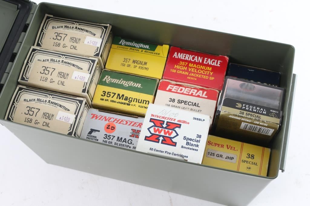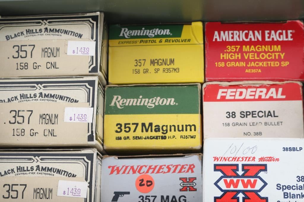 Approx. 190 rounds of factory 38 special and approx. 400 rounds of factory 357 Magnum, various brands in factory boxes.