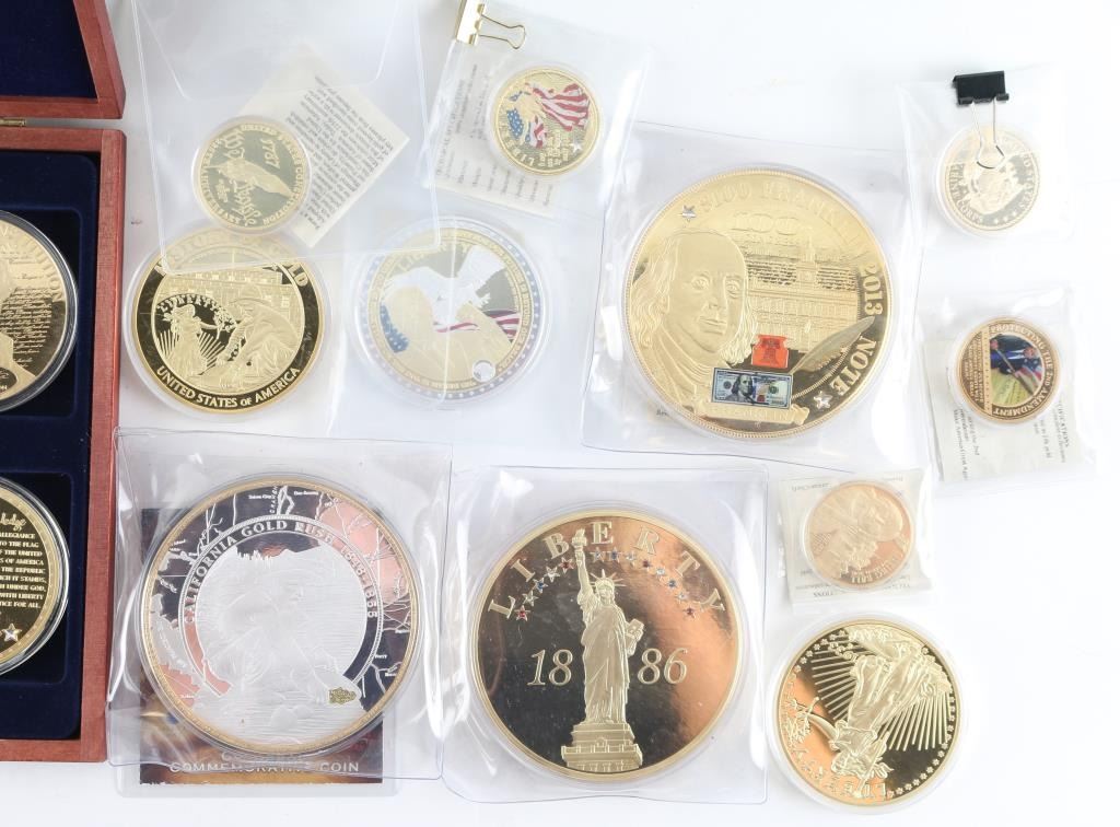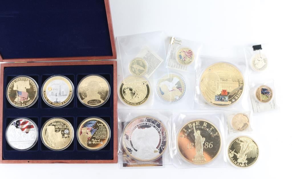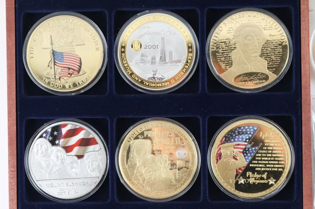 Here we have, from American Mint, a collection of commemoratives in various sizes, mostly copper with silver and or gold layering, including 1) The Star Spangled Banner/Ground Zero/United States Constitution/Mount Rushmore/Project Apollo/Pledge of Allegiance, all in a wooden display case. 2) Liberty $20. 3) U.S. Gold Bullion Depository, Fort Knox. 4) American Gold Rush. 5) Donald Trump Liberty. 6) Sitting Bull. 7) Happy Birthday Marines 8) Dawn's Early Light. 9) Donald Trump Protecting the 2nd Amendment. 10) 225th Anniversary of the U.S. Constitution. 11) Liberty 1886, and 12) $100 Franklin Note 2013. All of these are in very good to excellent condition. Nice way to either start a collection, or finish one. This is a steal.