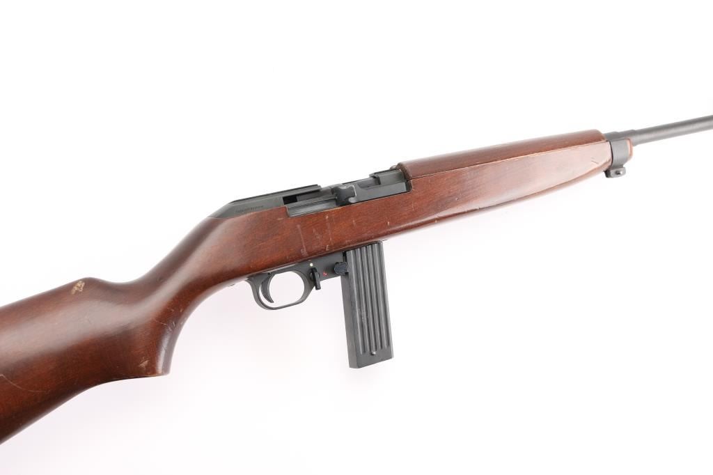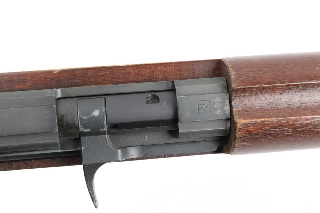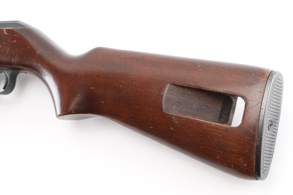 Made in West Germany in the style of the U.S. M1 Carbine. 18" barrel with protected front sight blade, no rear sight. Smooth hardwood stock, with sighting grooved handguard. Bore is excellent. Steel buttplate. Manual safety. Wood is good with minor scratches. Comes with one 15 rd magazine. NRA Condition is Excellent. Modern Firearm.