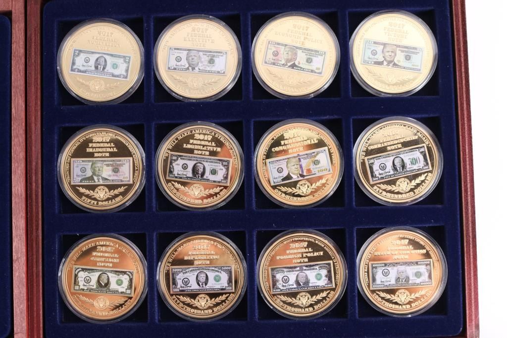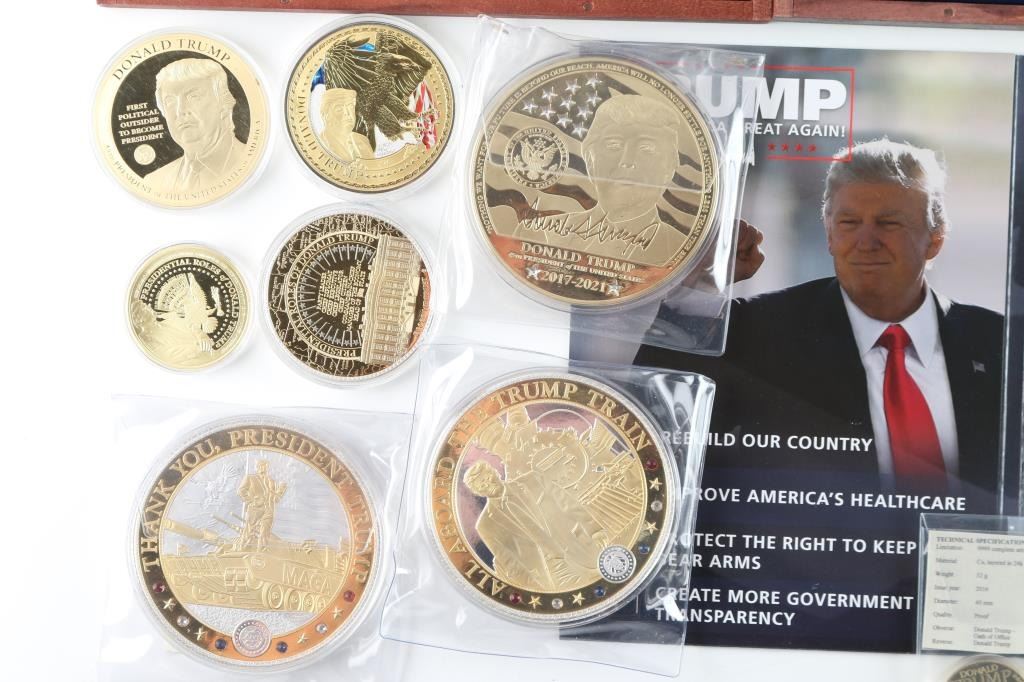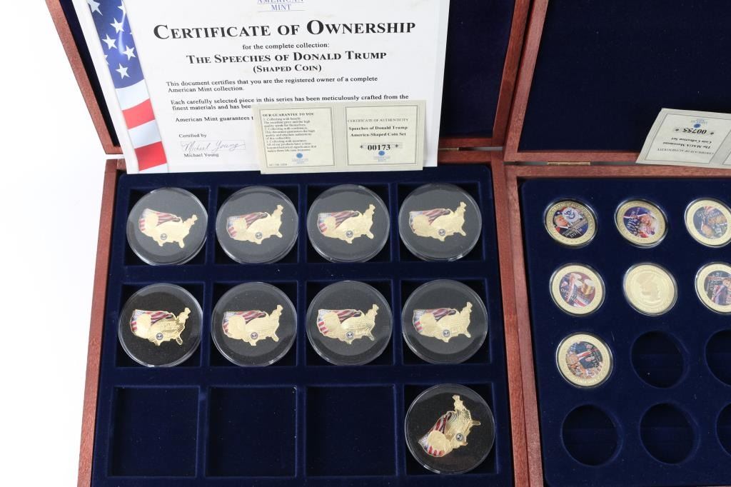 Here we have, from American Mint, a collection of commemoratives in various sizes, mostly copper with silver and or gold layering, including 1) Trump Banknote Tributes, 12 in a wooden display case. 2) Maga Movement coin set in wooden case, missing eleven coins to the set. 3) The Speeches of Donald Trump, missing three coins to the set. 4) Twelve Coin Set Make America Great Again. 5) All Aboard the Trump Train. 6) Thank You President Trump. 7) First Political Outsider to Become President. 8) Presidential Roles of Donald Trump. 9) Leaders of Freedom. 10) Battle. 11) Oath of Office. 12) Our Future. 13) Strengthening Our Borders. 14) Chief Diplomat. 15) Donald Trump 45th President. All of these are in very good to excellent condition. Nice way to either start a collection, or finish one. This is a steal.