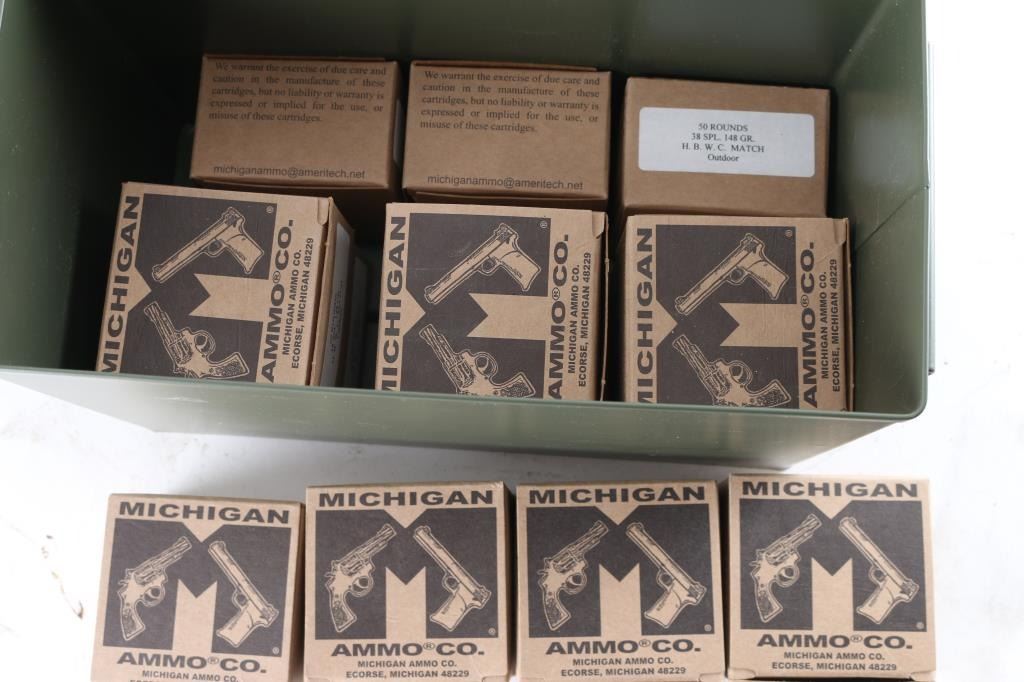 Approx. 650 rounds of new factory 38 Special ammo by Michigan Ammo Co., in factory boxes.