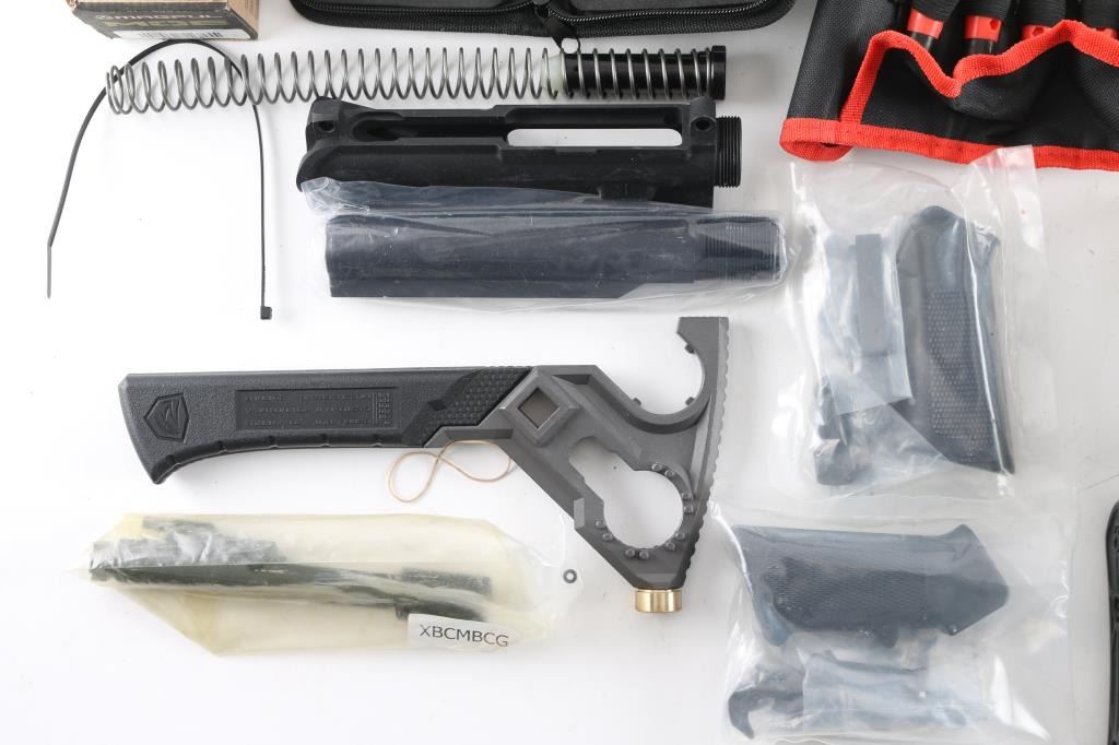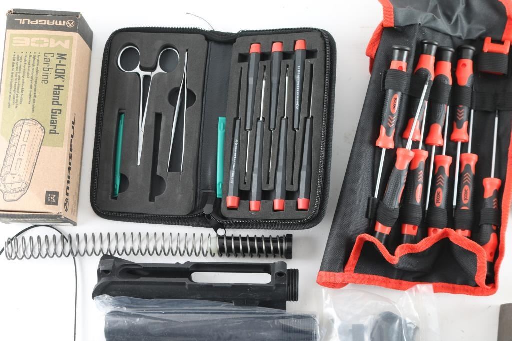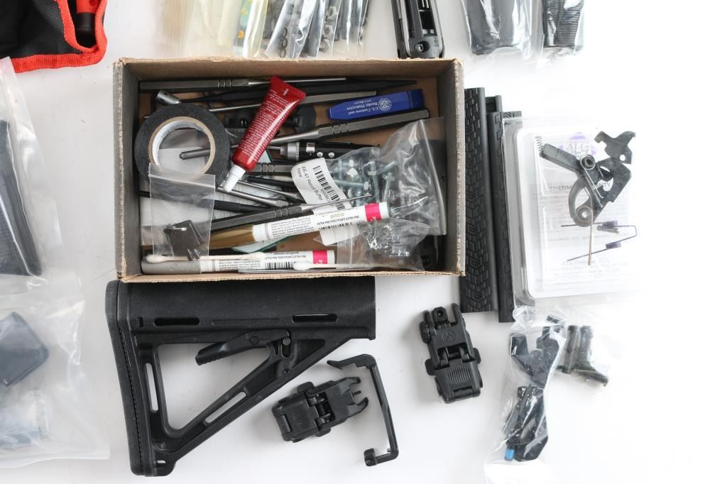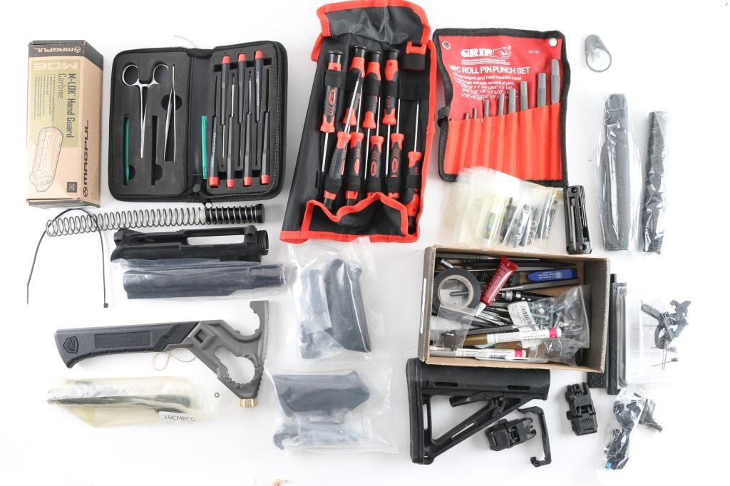 includes several buffer tubes, a bolt carrier group, two lower parts kits, an A3 upper receiver. Tools include an AR15 wrench combo tool, some screwdrivers for computer repair, punches.