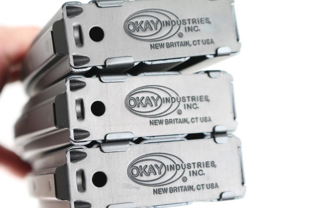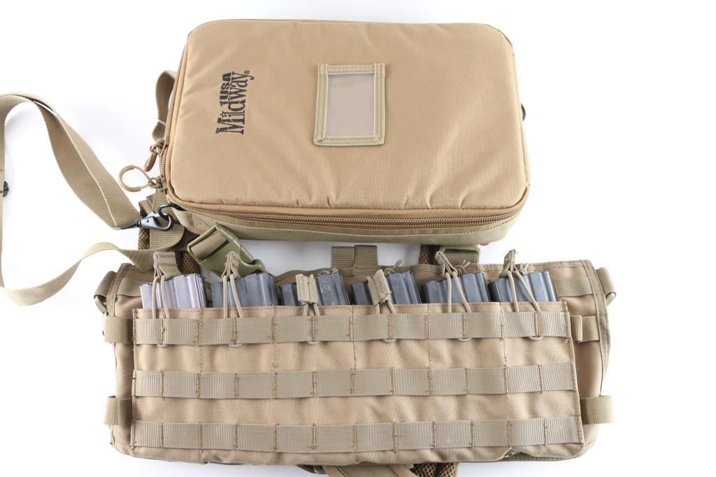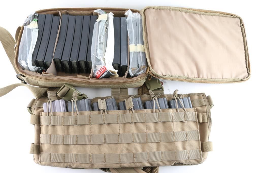 total of 29 mags, mostly aluminum USGI style, two steel bodied mags. All hold 30 rds. Very good or better condition. Also includes a MidwayUSA nylon zipper pouch with shoulder sling, and a Condor chest harness rig that holds eight mags.