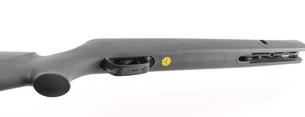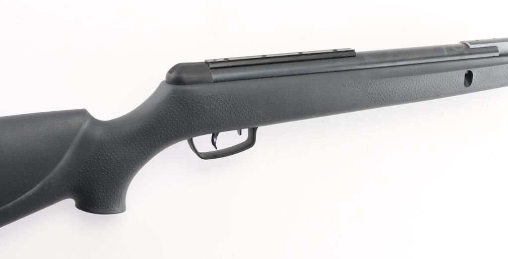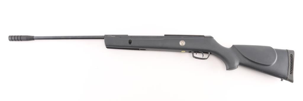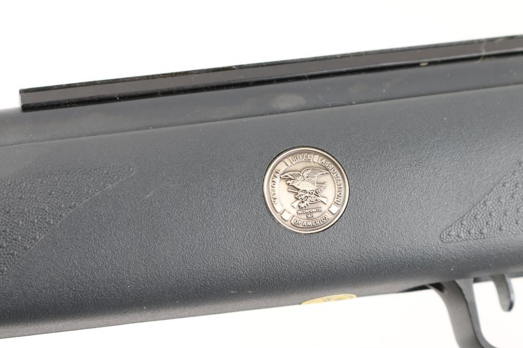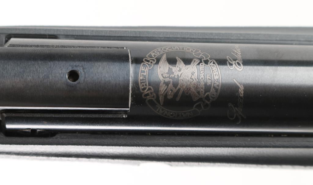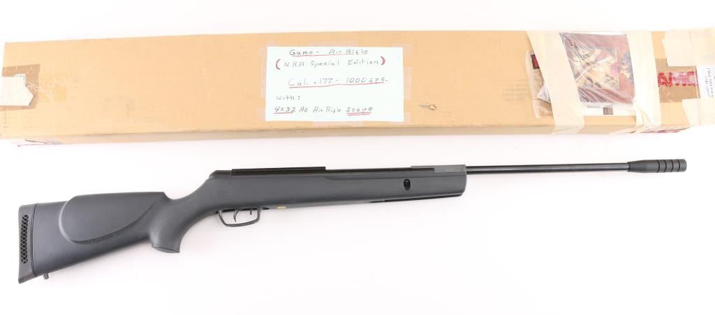 serial #NRA-007468 .177 cal., 18” barrel with a bright excellent bore. The metal surfaces of this Spanish-produced single shot, break-barrel cocking, spring piston air rifle, NRA logo and script “Special Edition” on the top of the barrel. The adult-sized textured gray synthetic Monte Carlo pistol grip stock with left and right side cheek pieces rates excellent and features a NRA gold-finish medallion on the left side of the forend. includes matching Gamo NRA 4x32 adjustable objective scope with duplex reticle and bright excellent optics. Per the manufacturer, this air rifle is capable of firing pellets at 1000 fps and is equipped with an adjustable trigger and the action appears to function well mechanically. New condition. Comes in NRA marked box with paperwork, manual, & scope.