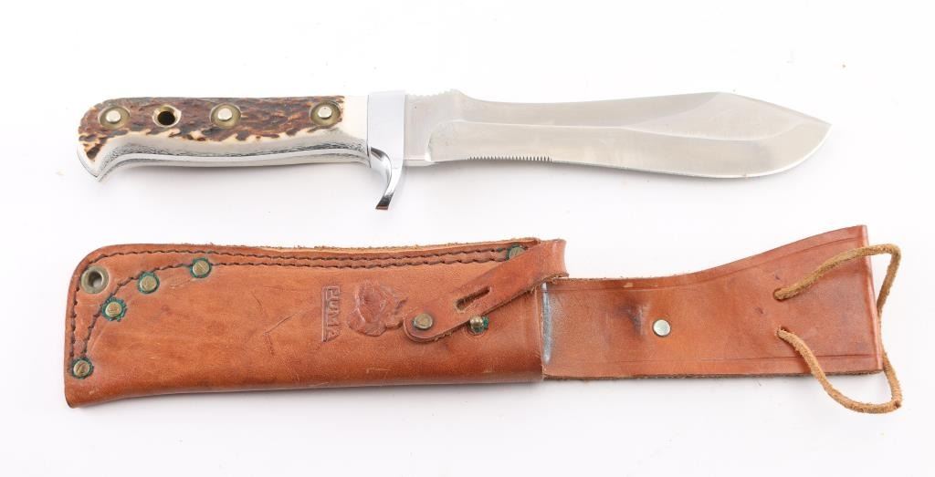 with 6" blade, 10.5" overall, stag handles and leather sheath. Knife is in excellent condition, sheath shows wear.