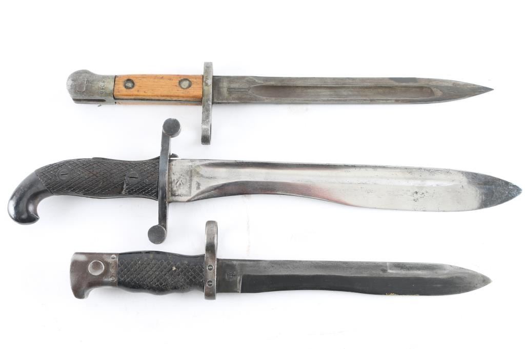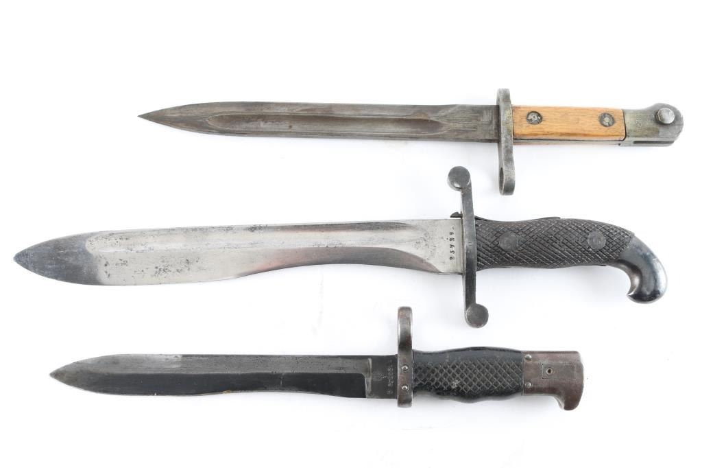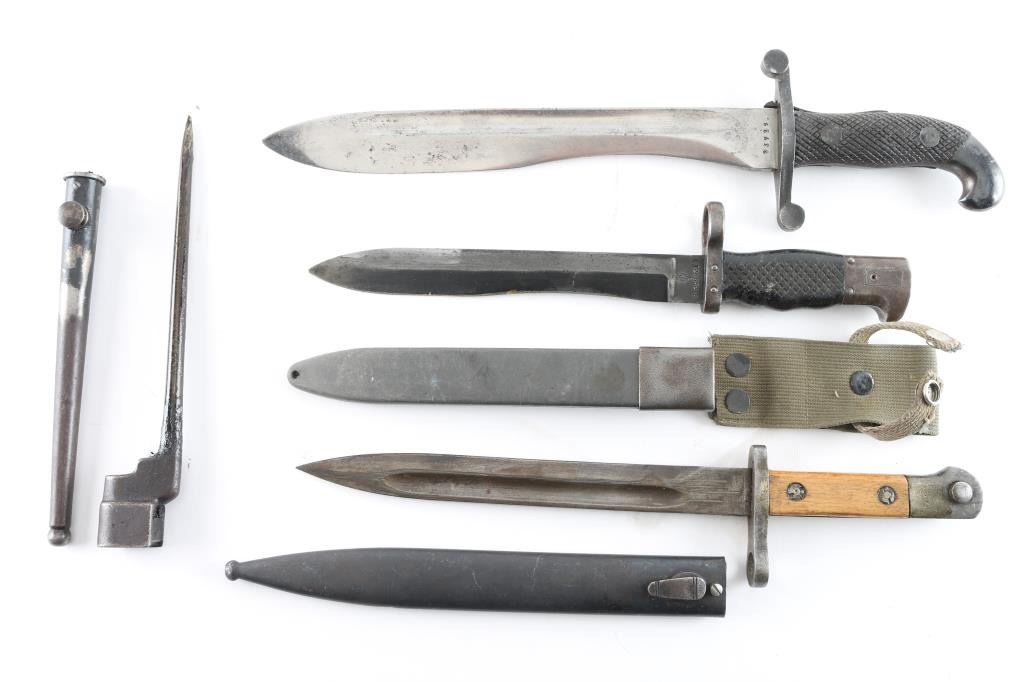 4 Total. 1) Turki9sh M1935 Mauser bayonet, 10" blade, pommel marked "AS.FA". with German K98 steel scabbard. 2) British No. 4 MK II spike bayonet with steel scabbard, 3) Spanish army M1907 bolo Knife, blade has cleaned, has some scattered pitting. No scabbard. 4) Spanish CETME M1964, model C bayonet, 9" blade, Toledo,& factory crests on ricasso, with scabbard.