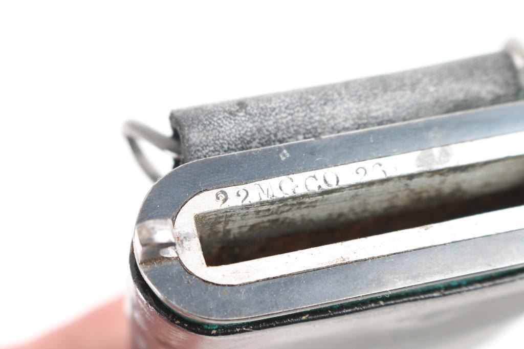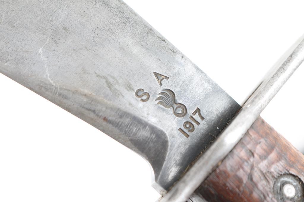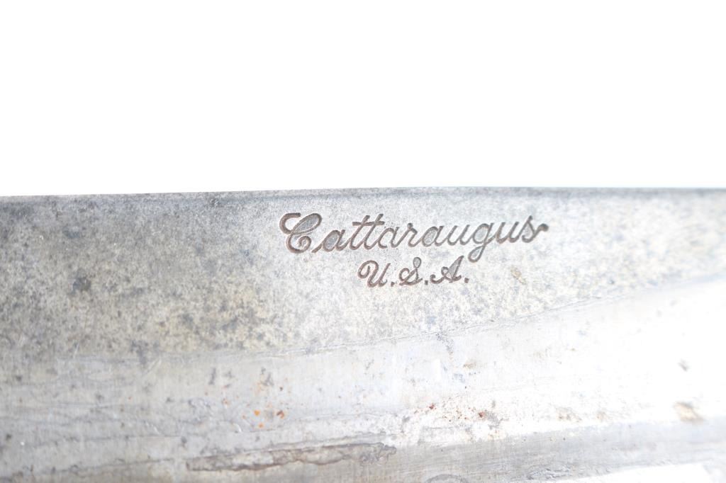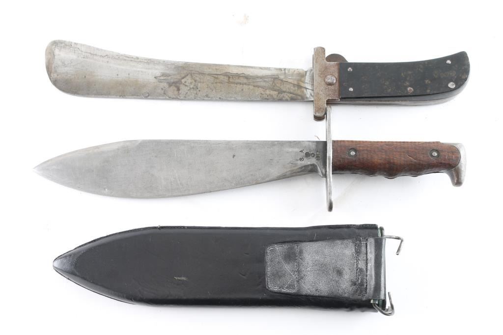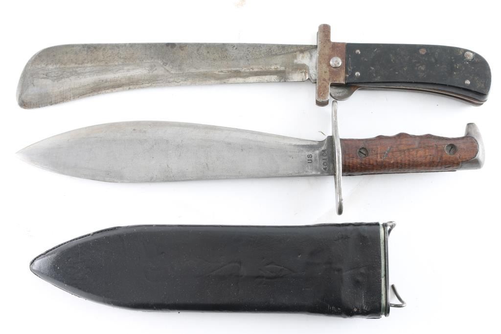 2 Total. 1) 'Cattaraugus' WWII US Army Air Corps Pilot Folding Machete Survival Bolo Knife. Marked 'Cattaraugus U.S.A.' on blade. The blade folds into the black bake lite grips for the parachute pack. 2) U.S. WW1 M1917 Springfield Armory Bolo knife, ricasso marked "SA", flaming bomb, "1917". Reverse marked "US" with serial number. original scabbard re wrapped in black leather embossed with "A.S.D"., & "USN, possibly during WW2.