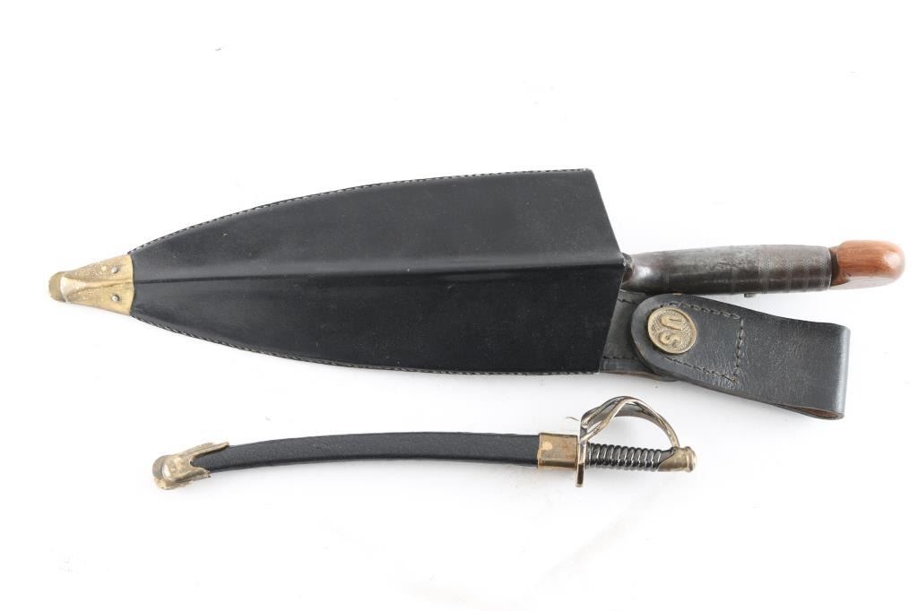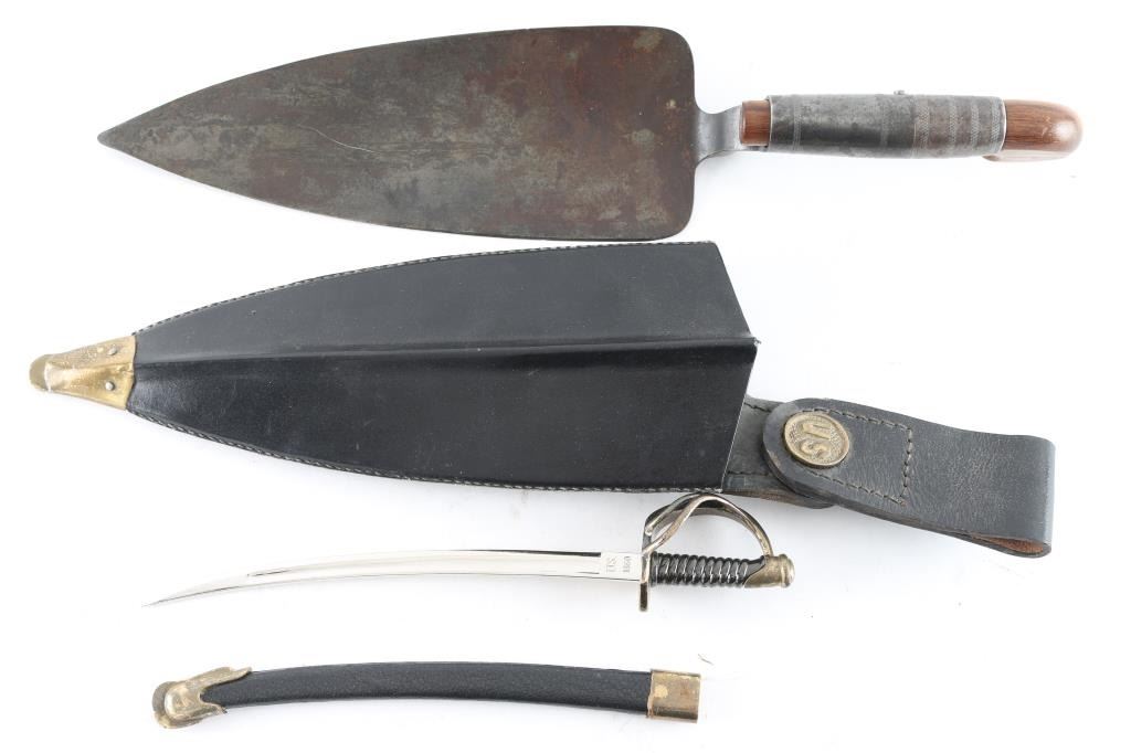This is a new reproduction of the combination bayonet and entrenching tool adopted in 1873 for use with the .45-70 Springfield rifle. It includes a leather covered metal sheath and a wooden handle insert. Also included is a M1860 letter opener sword, leather scabbard with metal fittings,ricasso marked "US 1860".