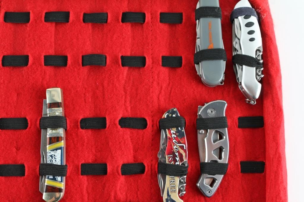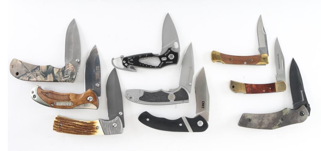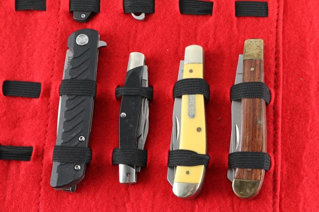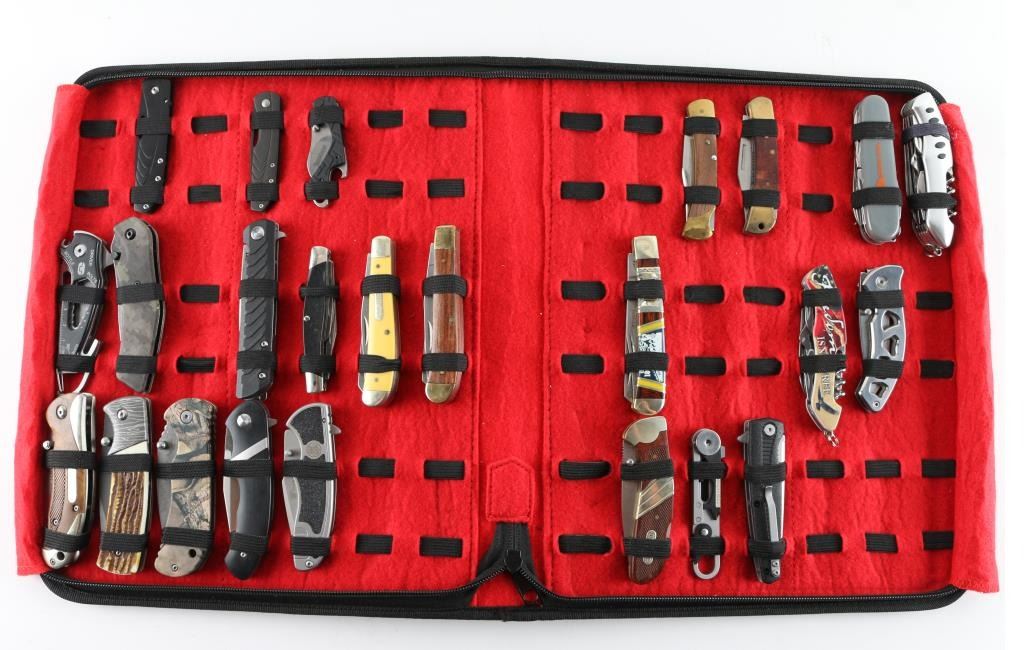 24 total in a travel case, all folders. Various makers including, Old Timer, CRKT, Kershaw, Ozark Trail, and more.