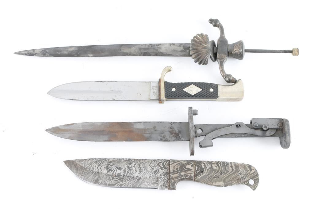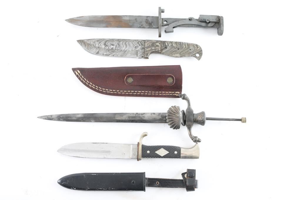 US M5 A1 Bayonet, missing grips, Damascus steel knife, 5" blade, missing grips, tooled brown leather scabbard, German Forestry dagger, 10" blade marked "Rosco", & "Hirschfanger" , complete except for grips, clam shell/acorns guard. Also included is a gGerman made knife made in the style of the Hitler youth dagger, made by Anton Wingen, The diamond shaped insert has a French Fleur-De-Lis design. With scabbard.