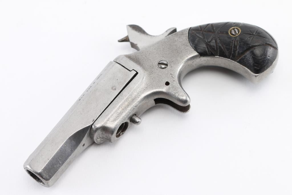 Iron framed single shot derringer circa 1870's with 2-9/16" octagon barrel, walnut birdshead grips, fixed sights and barrel swings sideways for loading. Partly eroded markings on top of barrel remain. Action is poor, missing parts, hammer stuck at rear. Bore is poor, rusted condition. Metal surfaces have been cleaned, with some patina remaining, some light pitting, slight contour losses from heavy polishing. Grips are poor, broken, with carvings on left panel. Condition is NRA Poor (missing parts) *** Antique Firearm ***