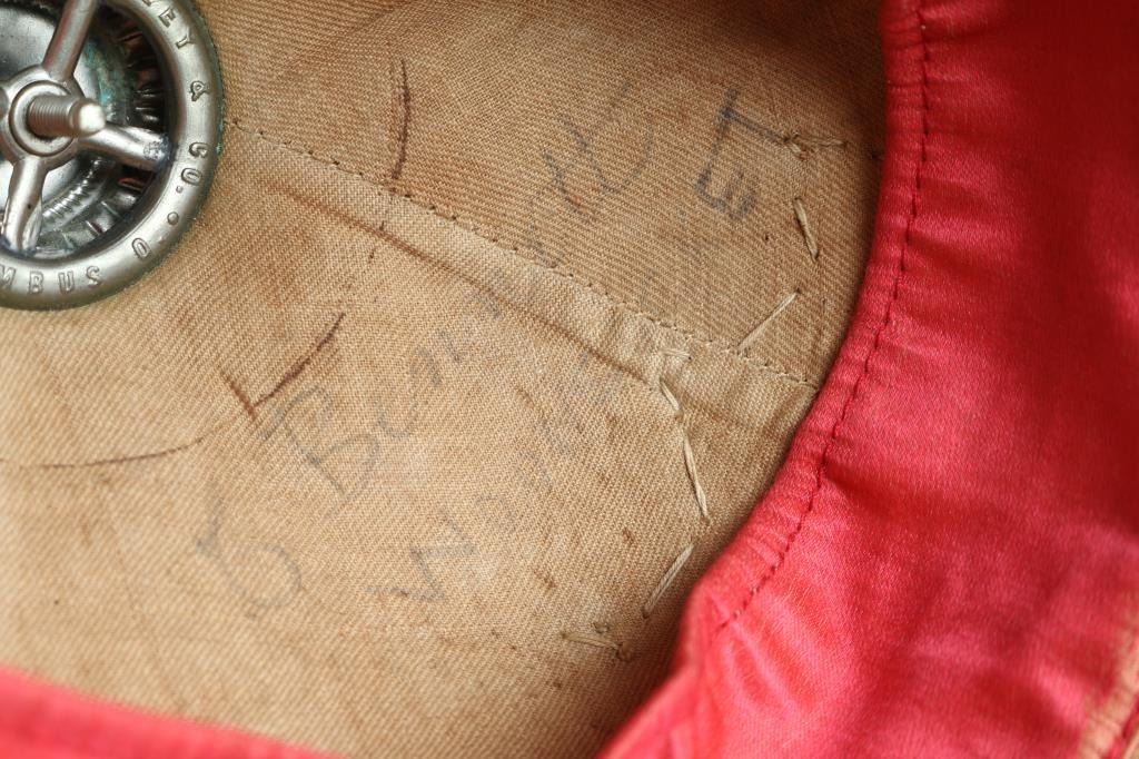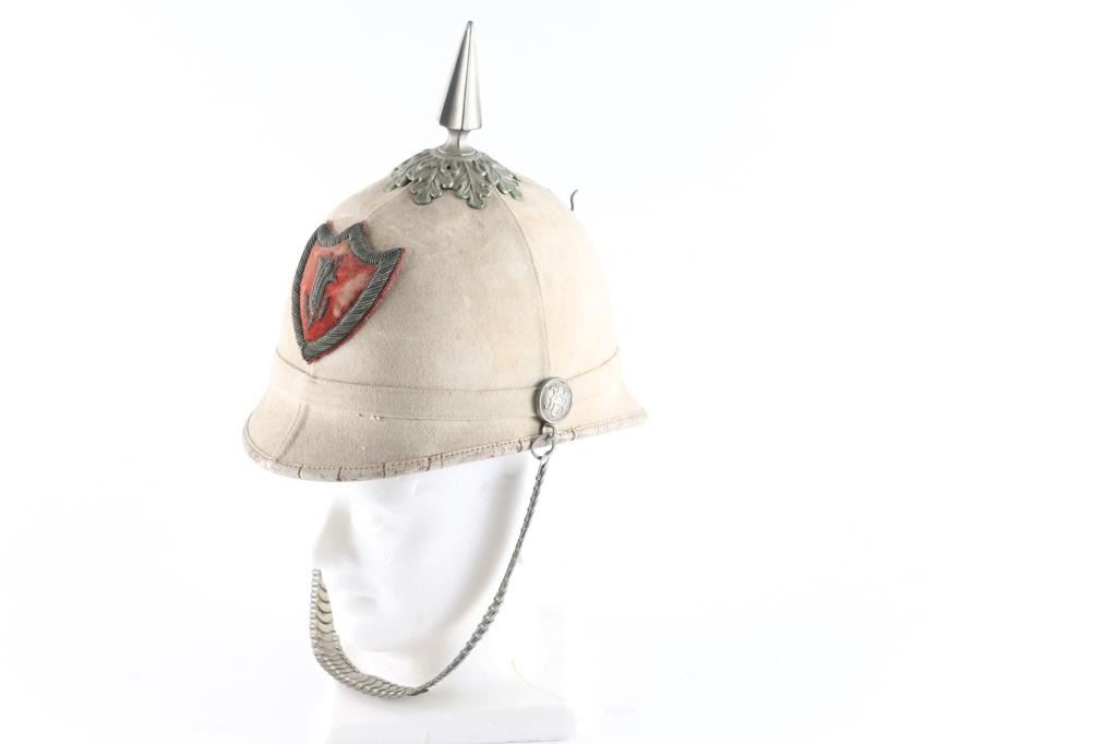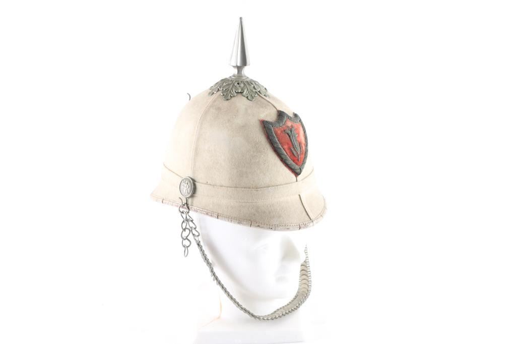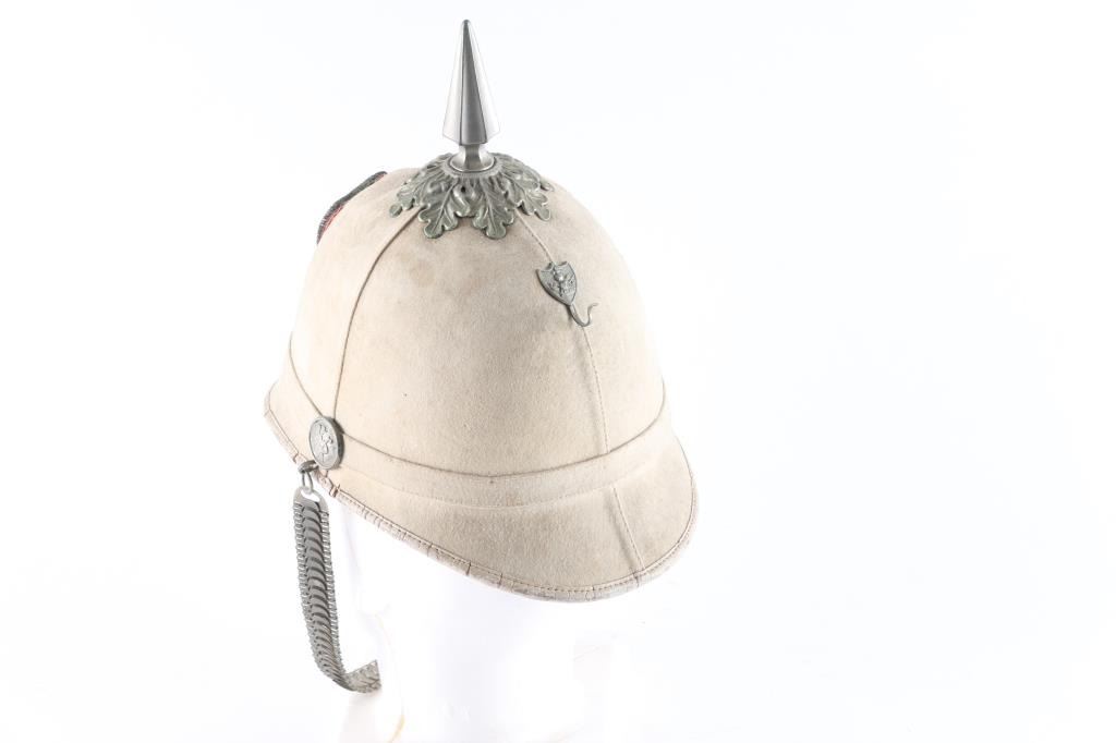 Fraternal organization pith helmet manufactured by Lilley & Co. in the late 1800's or early 1900's. The exterior of the helmet is kakhi-colored felt. Embroidered velvet badge is stitched on, top spike unscrews and is one of the original 1880's US military helmet spikes that Lilly & Co. used on many of their fraternal and ceremonial helmets in the early 1900's. Original scale chin strap with monogrammed attachment buttons - the monogram is "UR" (Under Ranks). Interior leather sweat band. "The M.C. Lilley & Co. Colombus,Ohio" marked on the interior spike base. Overall really great condition.