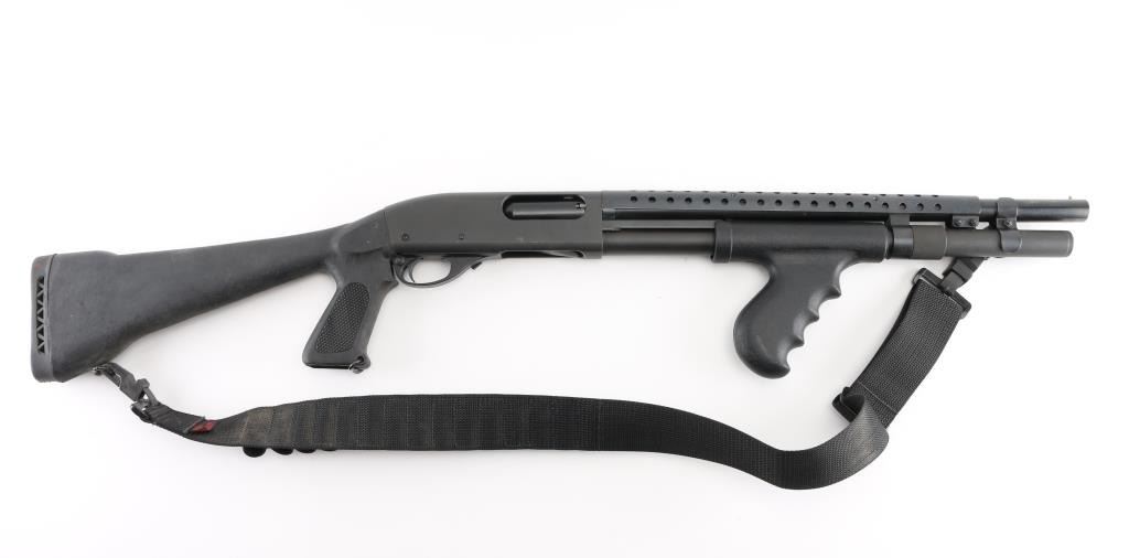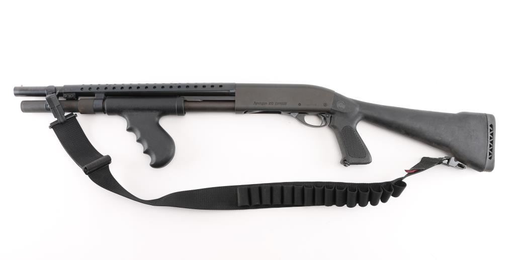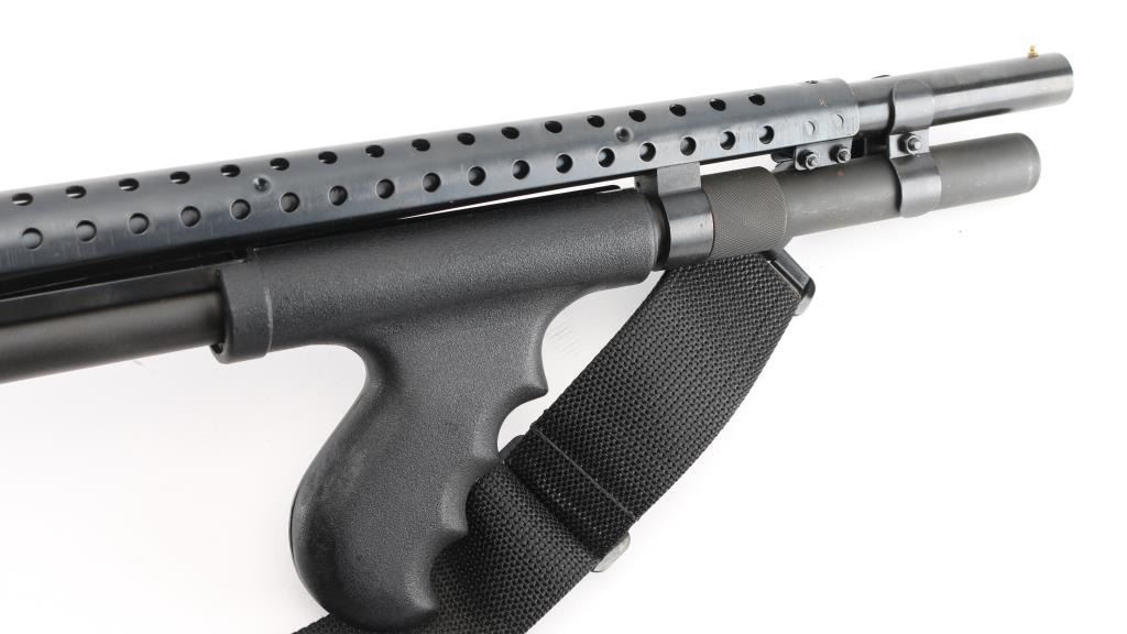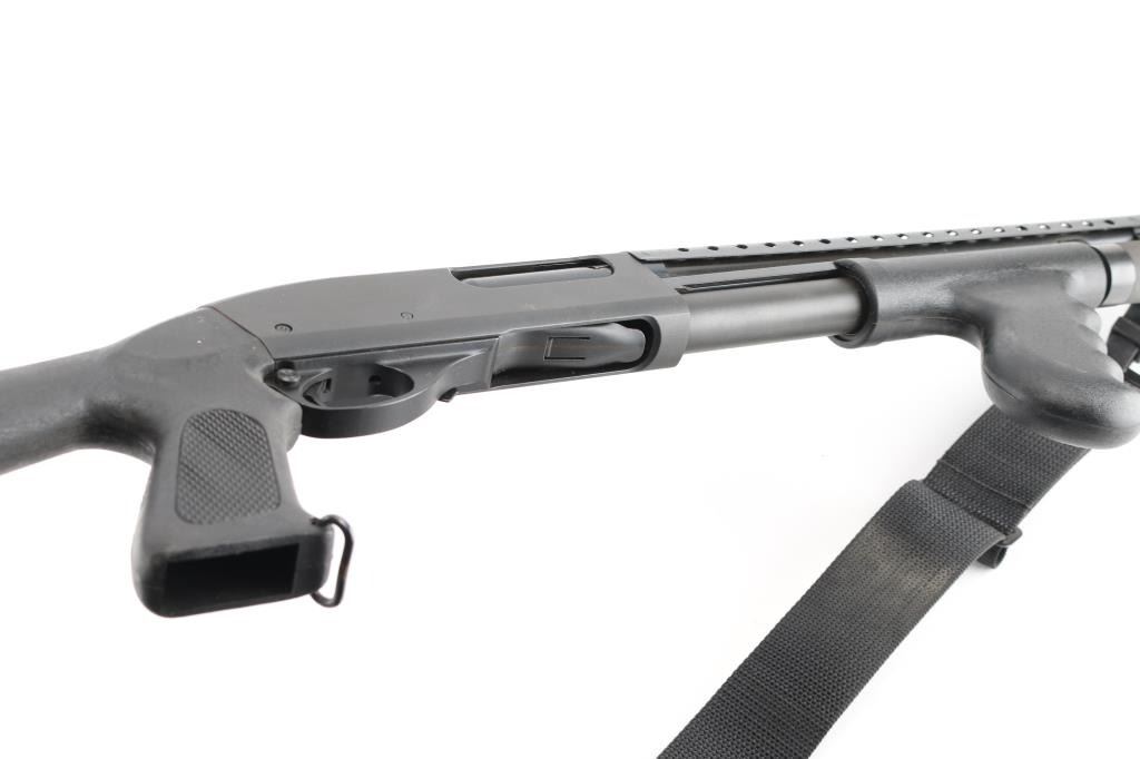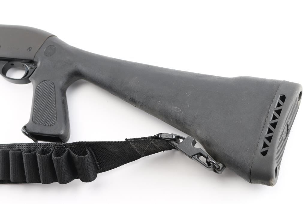 Pump/slide action shotgun chambered in 12 Ga. Takes 2 3/4" or 3" shells and has an 18" barrel with front brass bead sight. 14" LOP, Barrel heat shield, Choate black synthetic checkered pistol-grip stock with black synthetic finger groove pistol grip pump forearm, 6" magazine tube extension, sling swivels. Action is smooth. Metal finish is very good with minor scratches. Stock and furniture are very good with faint scrapes. Bore is excellent. Comes with 2" nylon ammo sling. NRA Condition is excellent. Modern Firearm.