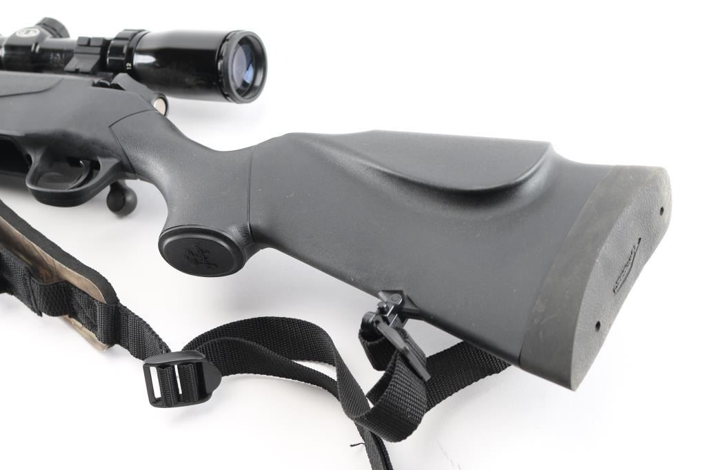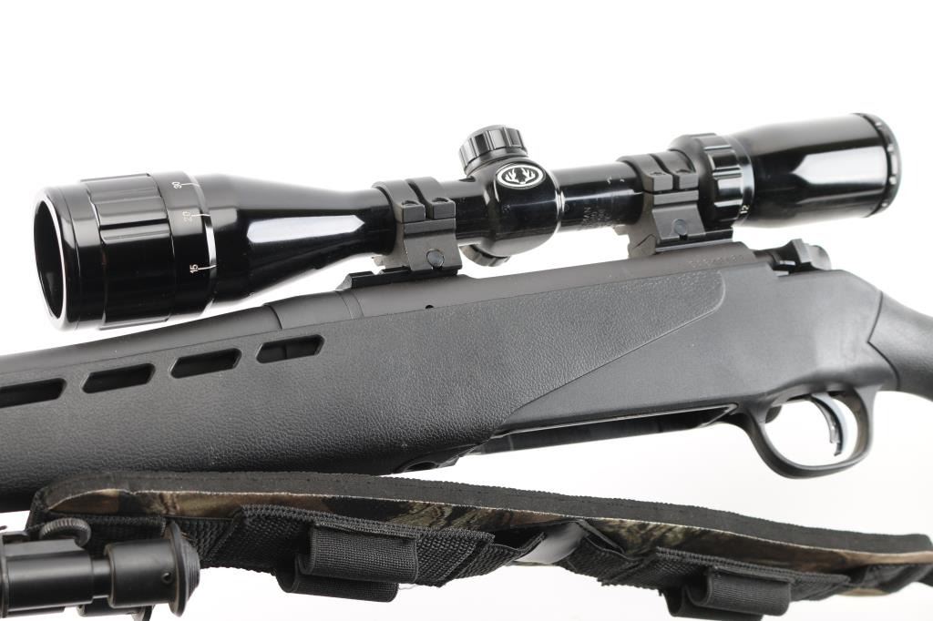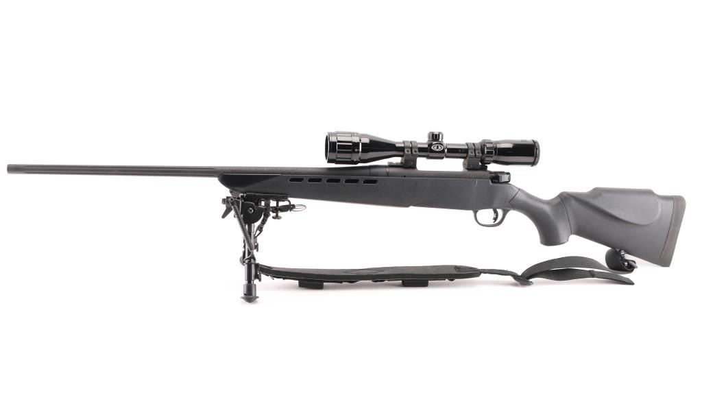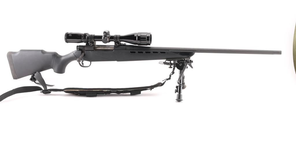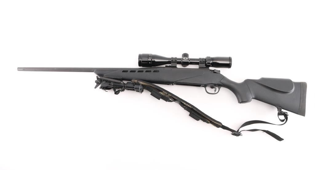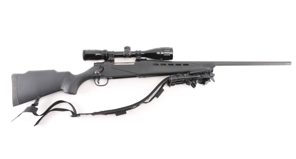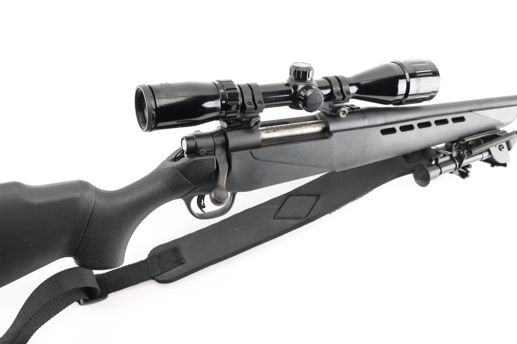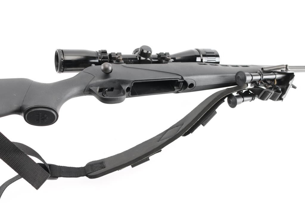 Bolt action sporting rifle, 24" fluted, tapered and crowned barrel, black polymer textured pistol grip stock with vented forearm and recoil pad, accu-trigger, detachable magazine missing, no sights, receiver tapped and drilled with scope mounts. Excellent bore and action but a little dirty. Comes with Bushnell 4 X 12 scope with clear lens and Butler Creek scope cover. Condition is NRA Excellent. Modern Firearm.