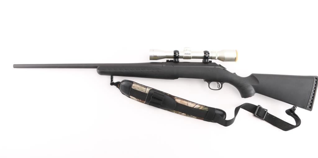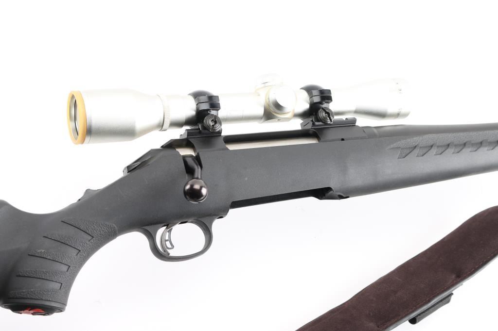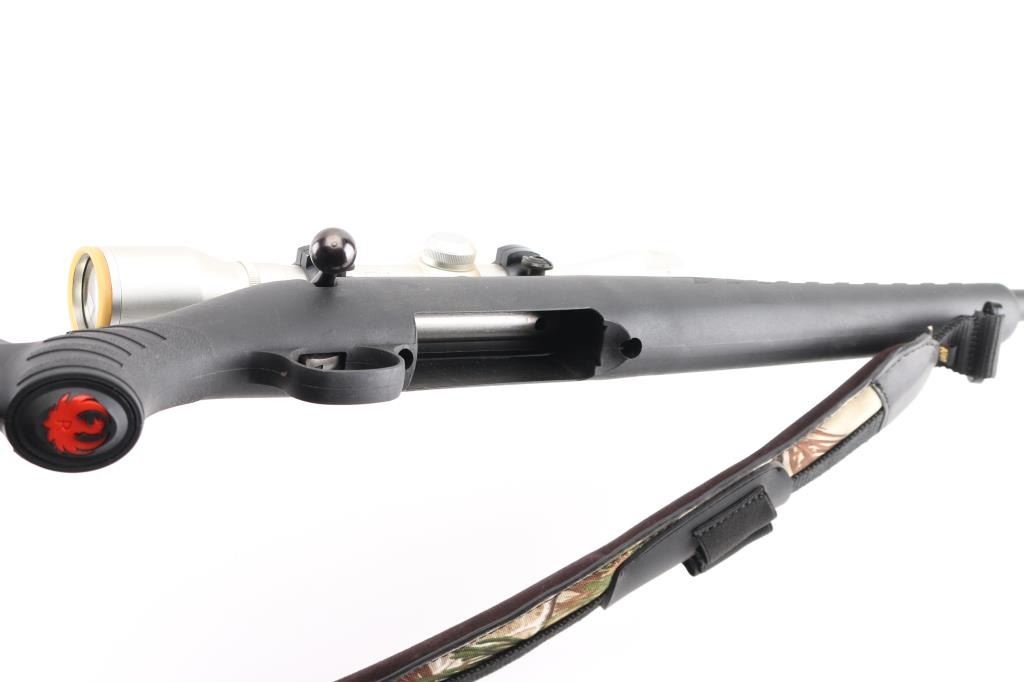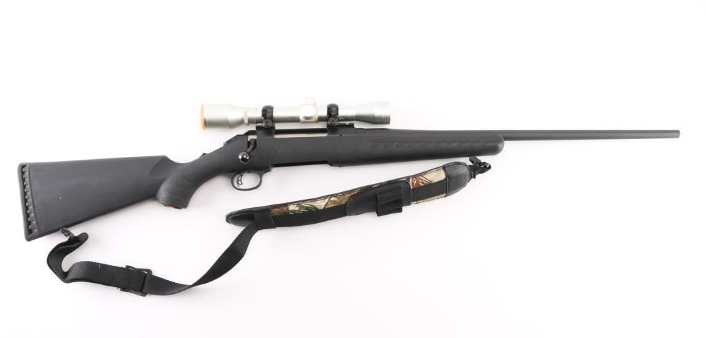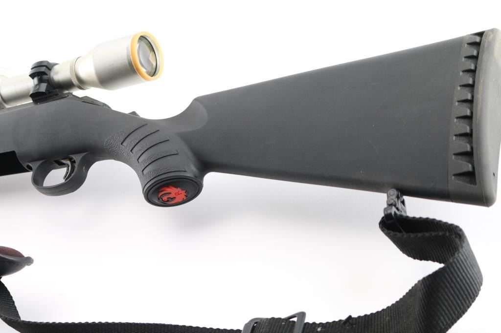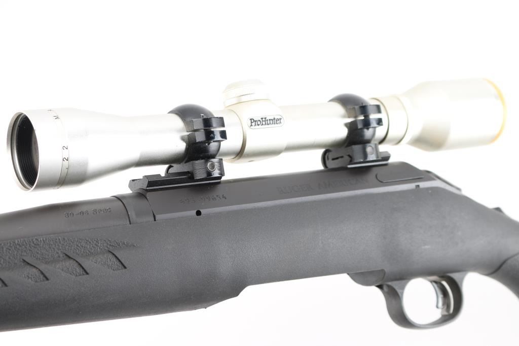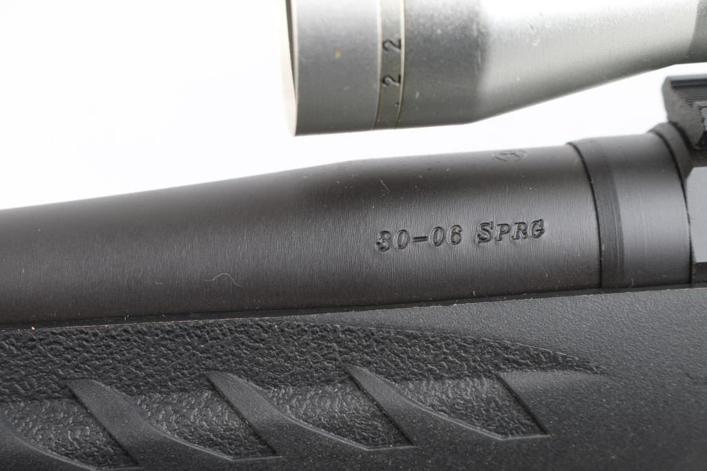 American made bolt-action rifle chambered in 30-06 Sprg. Features a 22" blued barrel with no sights, tang safety, missing detachable box magazine, black synthetic stock with textured fore end and wrist, blued sling swivels, plastic Ruger logo grip cap, smooth rubber recoil pad. smooth accu-trigger, LOP is 13 3/4". Bore is excellent but a little dirty. Metal retains 99% of its finish. Comes with a mounted silver ProHunter 4 X 32 scope and Allen Camo padded ammo sling. Condition is NRA Excellent. **Modern Firearm**