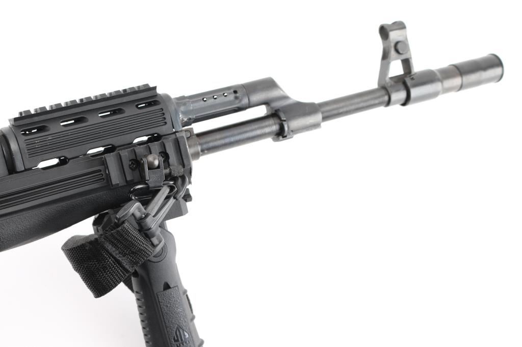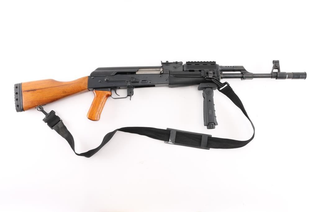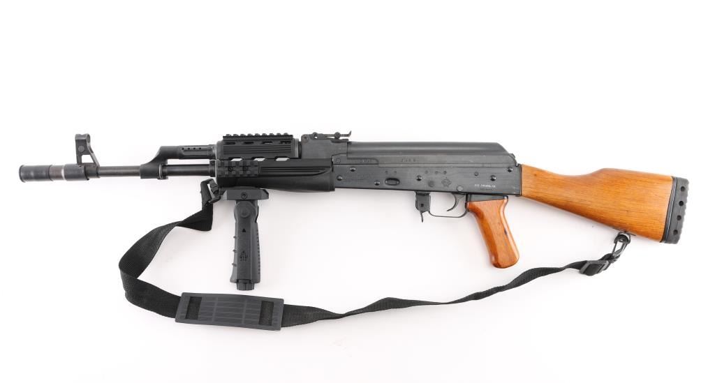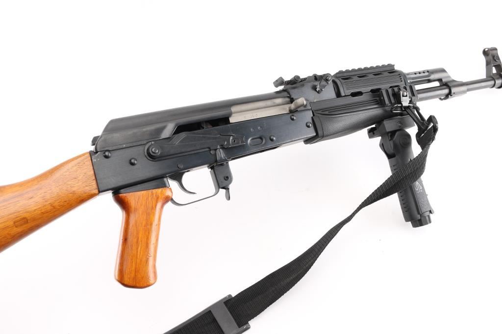 AK47 style semi-automatic sporting rifle chambered in 7.62 X 39mm, made in China.16" barrel with 2" muzzle brake, hooded front post with red accent and adjustable rear sight, blued finish, black vented synthetic forearm with Picatinny rails at 3, 12 and 9 o'clock positions, smooth wood stock with black rubber recoil pad and wood pistol grip, manual safety, magazine release lever, sling swivels. Bore is excellent and action is smooth. Retains 98% of it's finish with some pitting and little rust on muzzle brake. Wood has some shallow scrapes. Comes with attached UTG 5 position front grip and 1 1/2" sling/strap. Condition is NRA Excellent. Modern Firearm.
