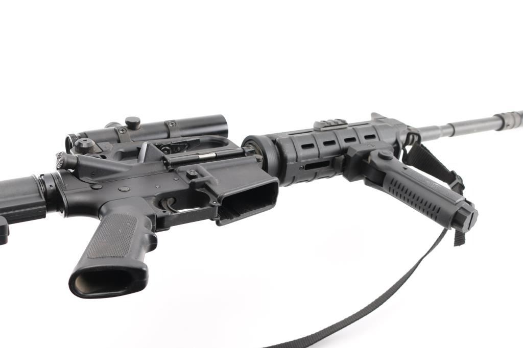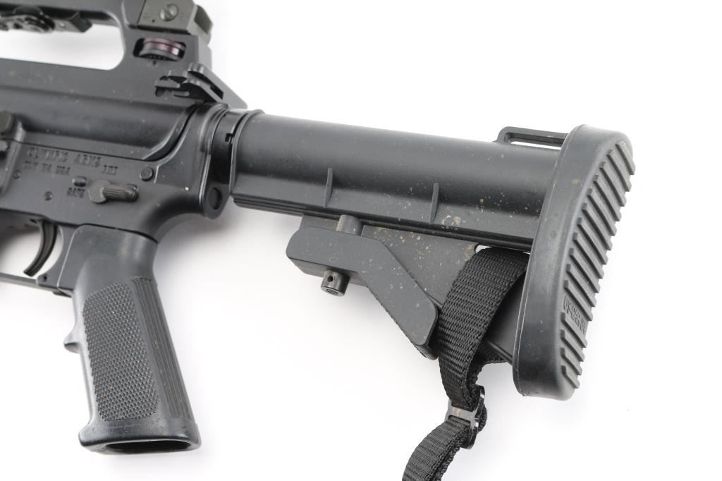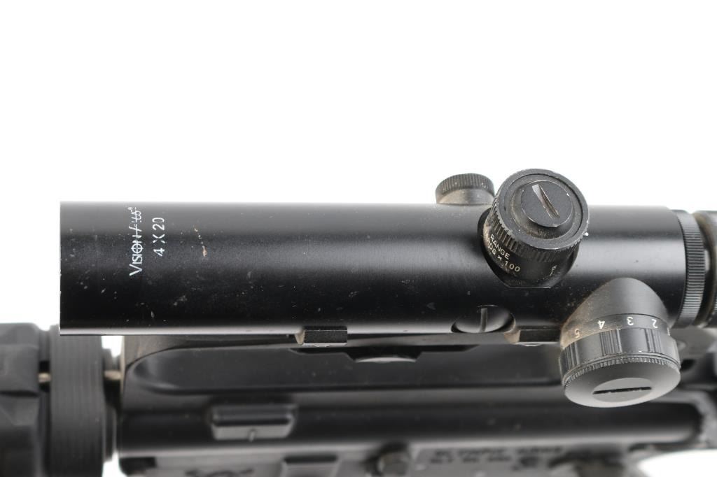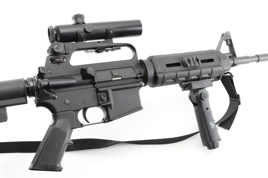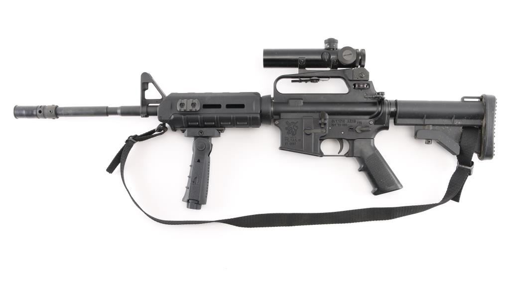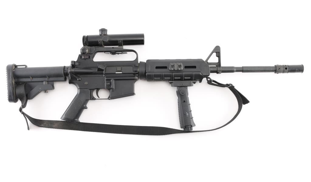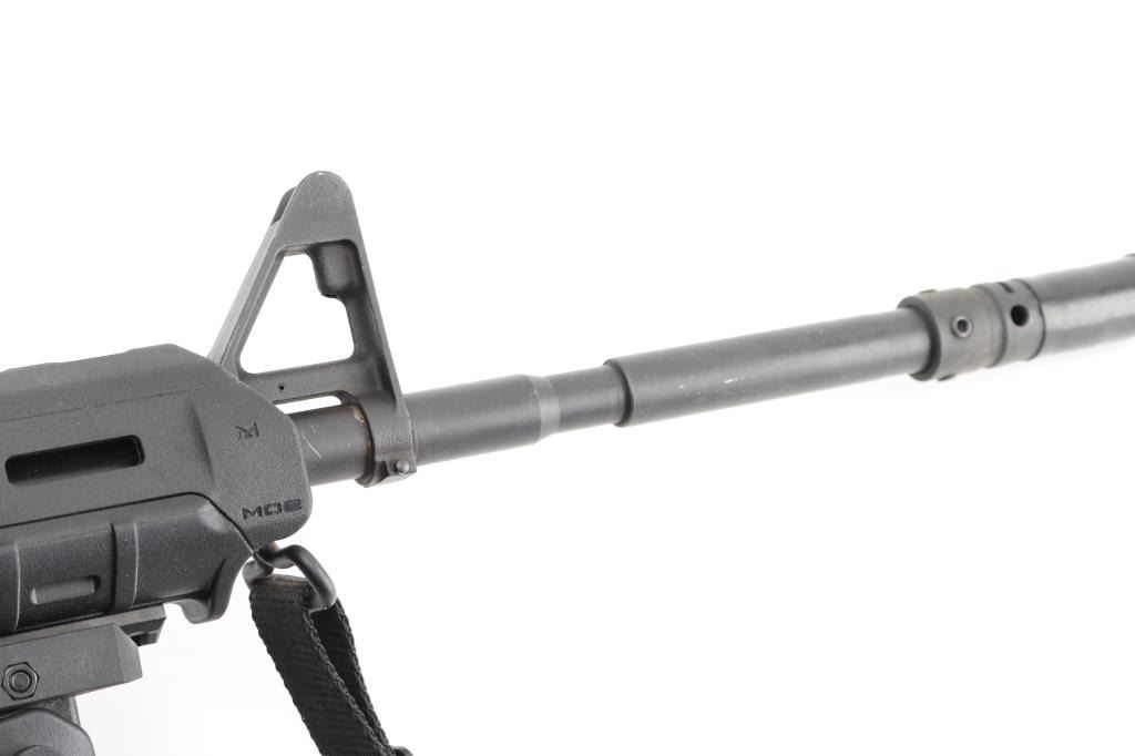 AR-15 style semi-automatic sporting rifle chambered in 5.56 NATO. 16" stepped-down barrel with 2 1/2" muzzle brake, mid-length gas block with protected front post sight and sling swivel, adjustable rear aperture peep sight in upper receiver handle, black Magpul MOE forearm with Picatinny rails, 4 position adjustable buttstock with recoil pad and standard black polymer checkered pistol grip, brass deflector, forward assist, charging handle and smooth trigger, push button magazine release. Comes with mounted 4 x 20 compact scope, UTG 5 position front grip and 1" black nylon web sling. Retains 99% of it's parkerized finish with little to no edge wear. Bore and overall rifle is excellent but dirty. Scope has clear lens. Condition is NRA Excellent. Modern Firearm.