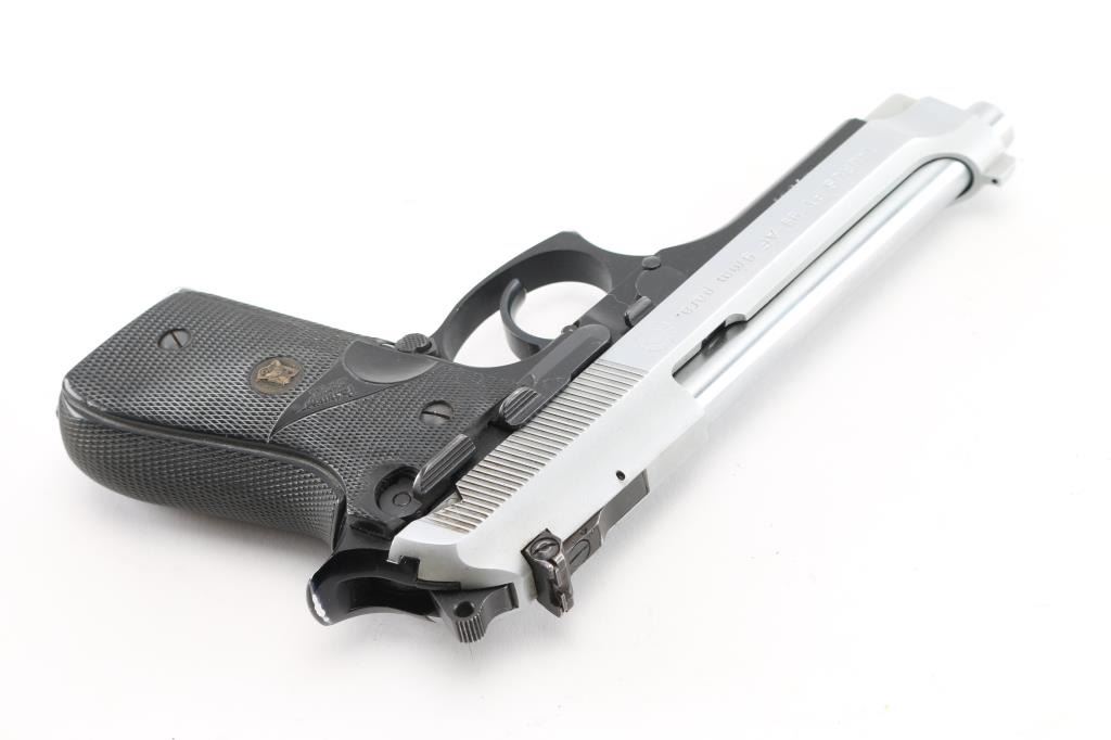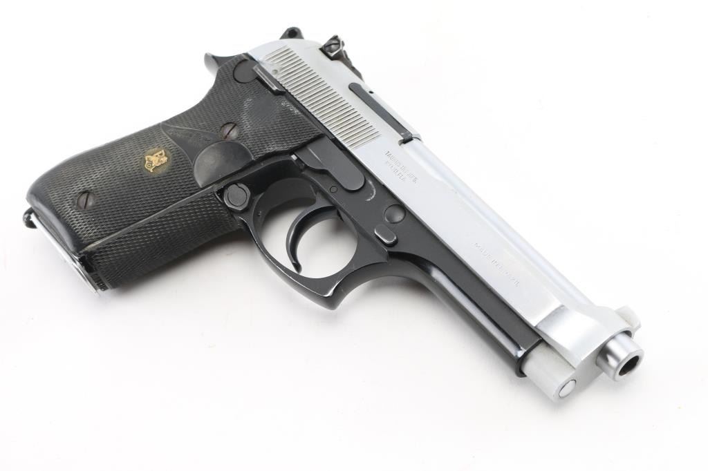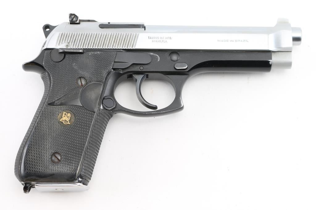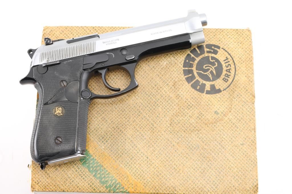 Semi-automatic pistol made in Brazil, imported by Taurus International, Miami FL. Features two toned finish, stainless slide & barrel over black anodized alloy frame, 4.75" barrel, fixed front & adjustable rear sights, open top slide, manual safety on both sides of frame, black rubber Pachmayr wrap-around grips, lanyard stud at butt. Bore is excellent. Slide is excellent with few handling marks, frame retains 90% finish with edge losses. Includes spare magazine, manual, factory styrofoam box with cardboard sleeve. Condition is NRA Very Good *** Modern Firearm ***