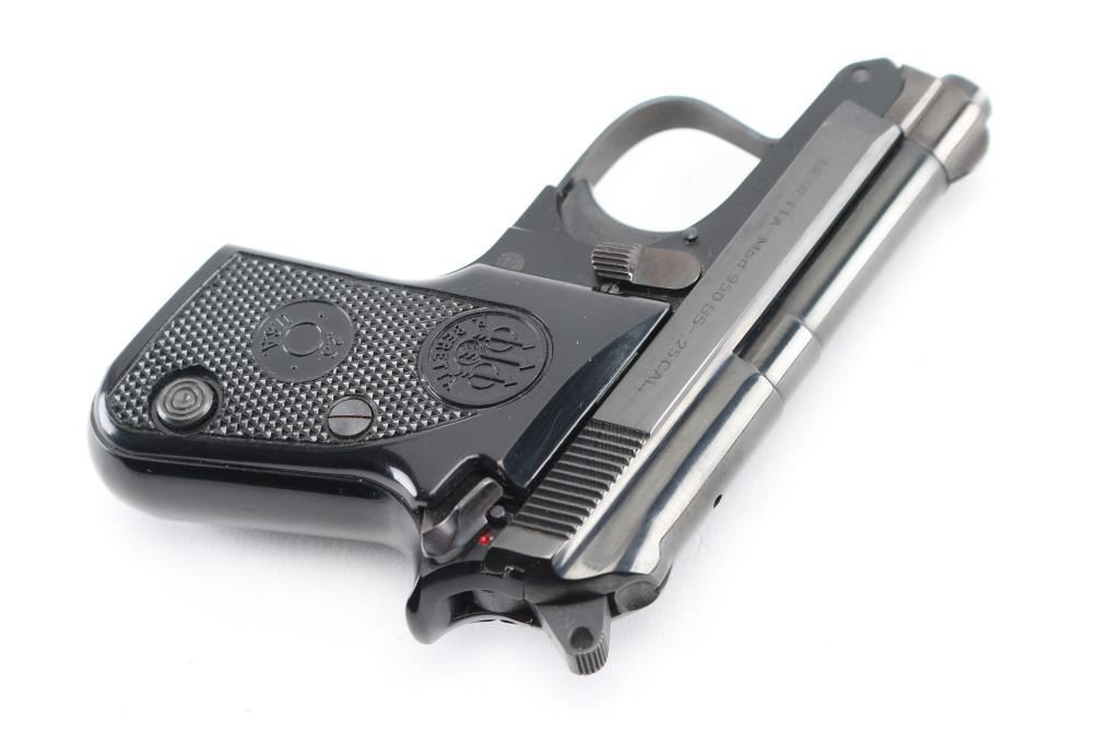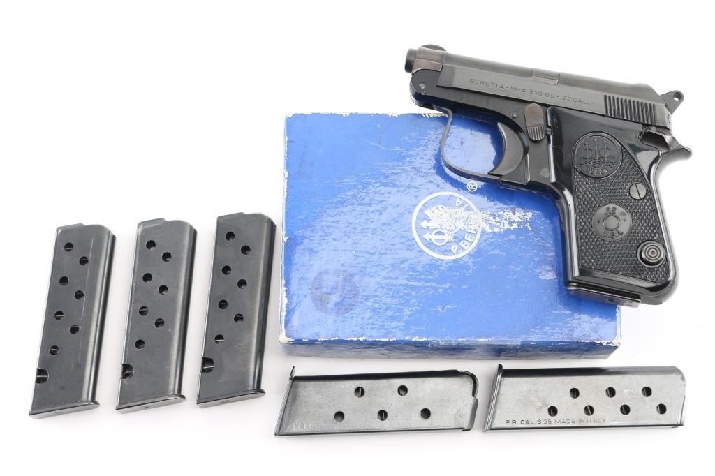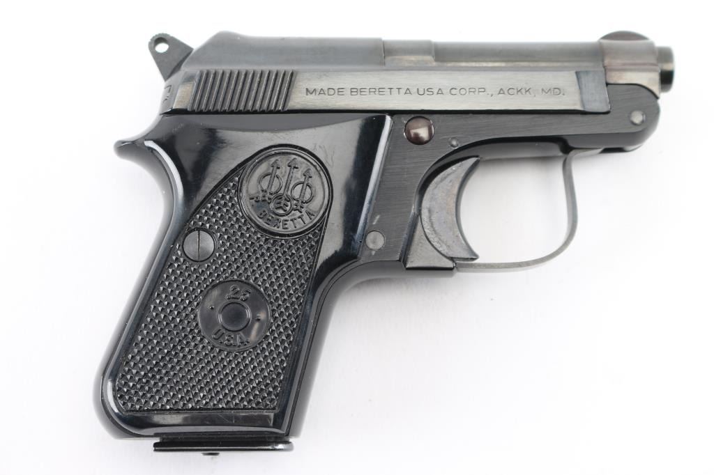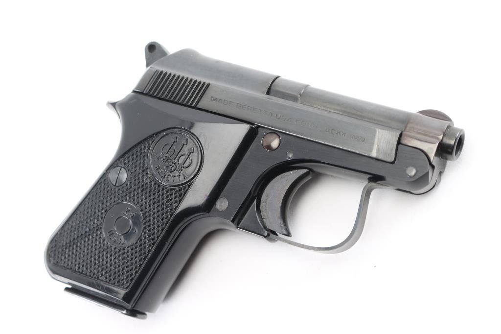 American made single action semi-automatic pocket pistol chambered in .25 Auto. Features a blued/black finish, 2.4" tip-up barrel, rear cocking serrations on the slide, fixed sights, smooth trigger, serrated round hammer spur, thumb safety, push button magazine release, factory 8 round magazine and two-piece checkered black plastic grips with Beretta insignias. Bore is excellent. Pistol exhibits approximately 95% of it's matte finish showing light edge wear and scattered handling marks/scratches. Includes the original two-piece factory cardboard box with manual and five spare magazines Condition is NRA Very Good. ***Modern Firearm***