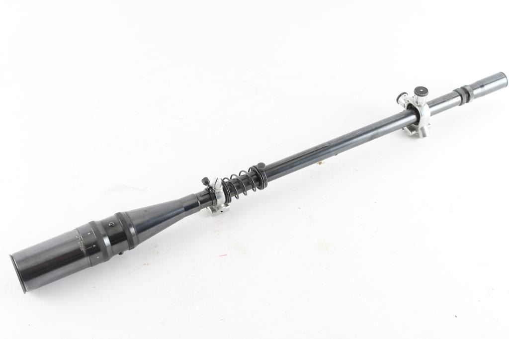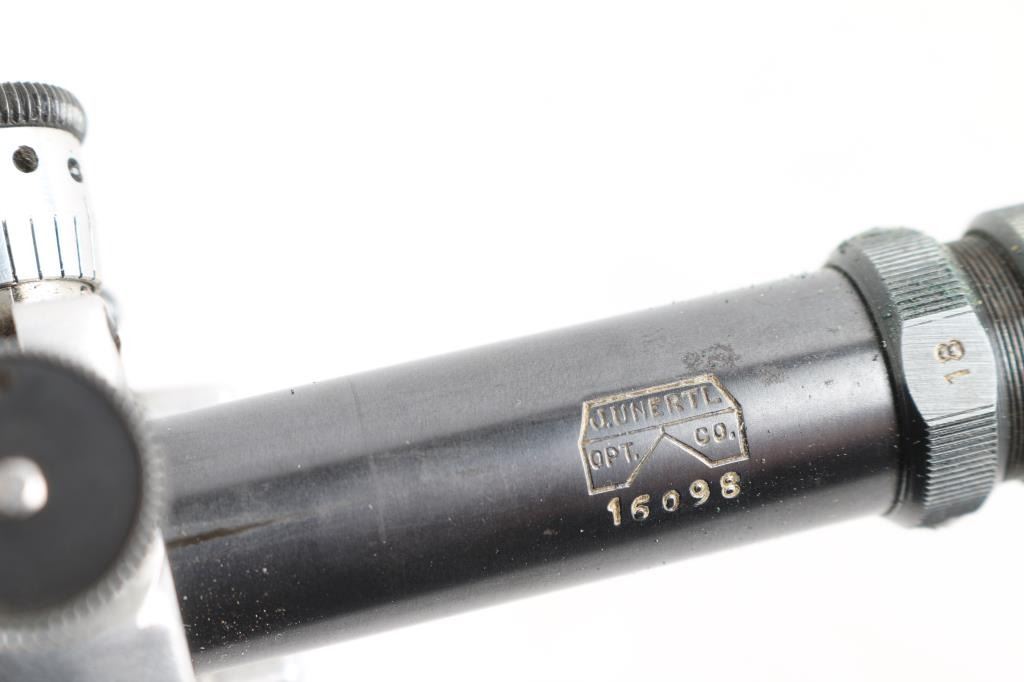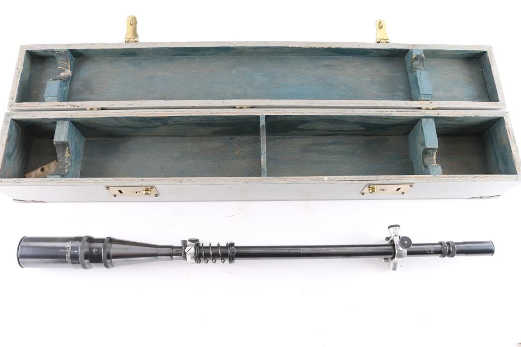 with rings to fit dovetail blocks. In very good overall condition, fine crosshair, clear view, metal threaded lens caps. Comes in a fitted wood case.