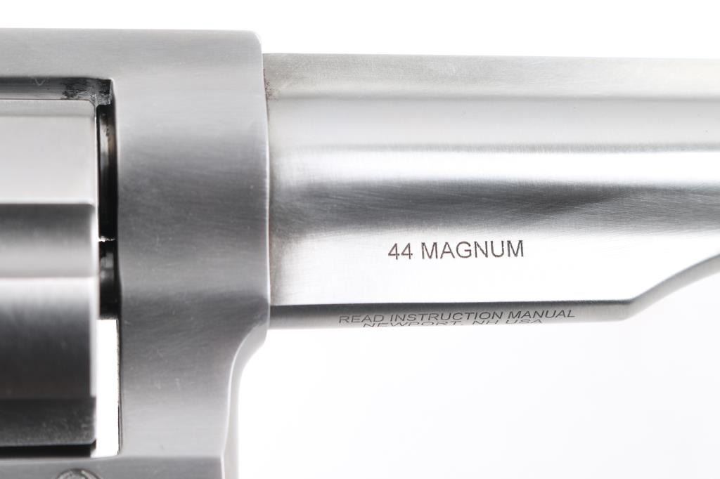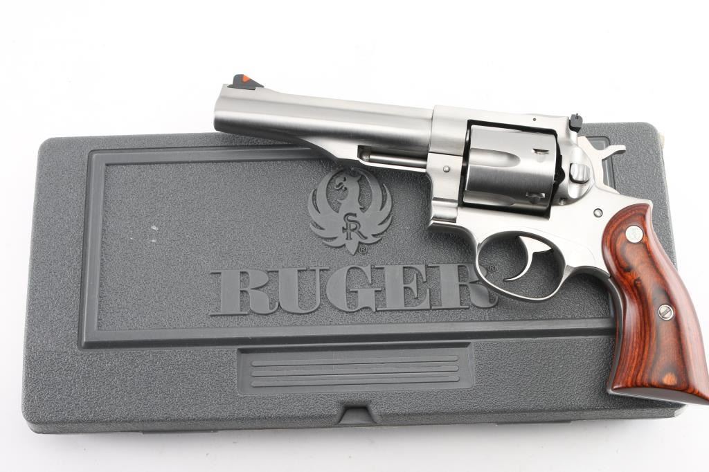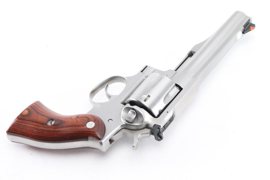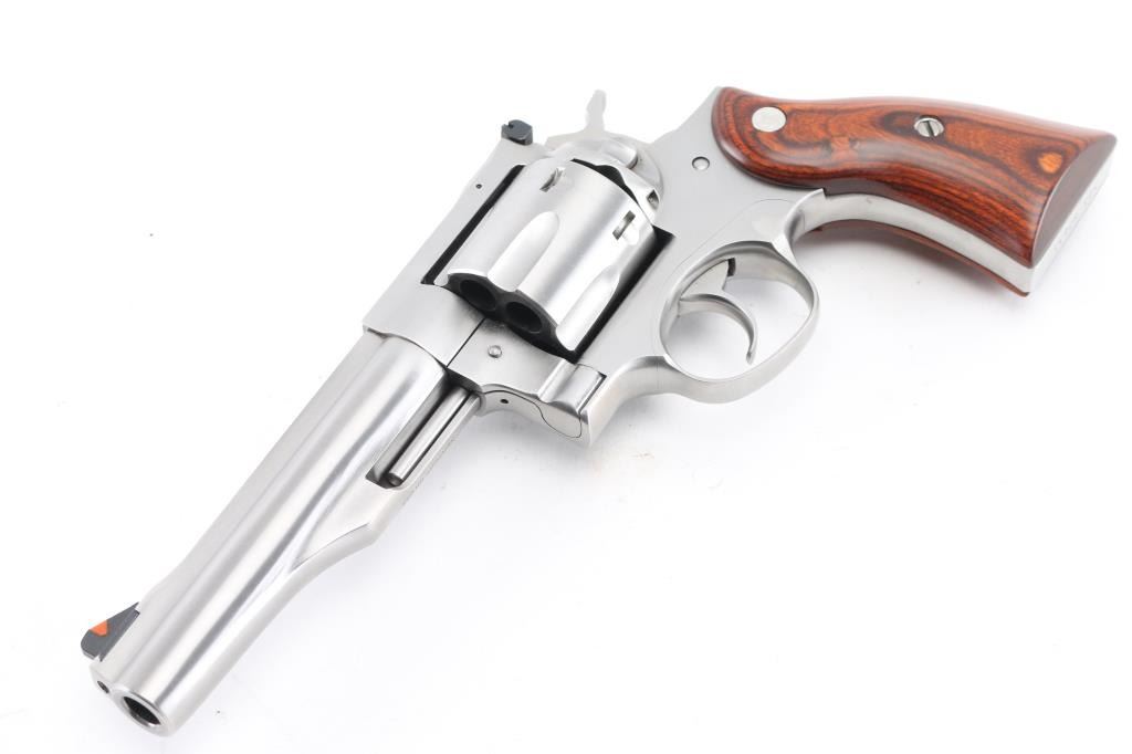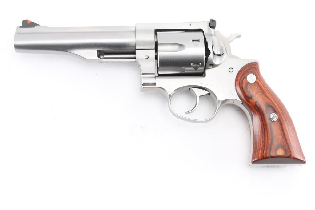 Stainless steel large frame double-auction revolver chambered in .44 Magnum, manufactured circa 2015-2018. Features a satin stainless finish, 5 1/2" barrel with serrated sighting rib, dovetailed serrated ramp front sight with orange insert, adjustable rear sight with white outline, smooth trigger, knurled hammer spur, transfer bar safety, fluted six-shot cylinder, shrouded ejector rod, and two-piece smooth brown laminated wood grips with Ruger medallions. Includes the original factory grey hard case with the label stamped "UGB", and a set of black rubber Pachmayr "Gripper" grips. . Revolver exhibits only light handling marks and a very faint drag line on the cylinder with no major wear observed. Action is smooth with very good lock-up, the bore appears pristine but slightly dirty, and the wood grips are fine. Condition is NRA Excellent *** Modern Firearm ***