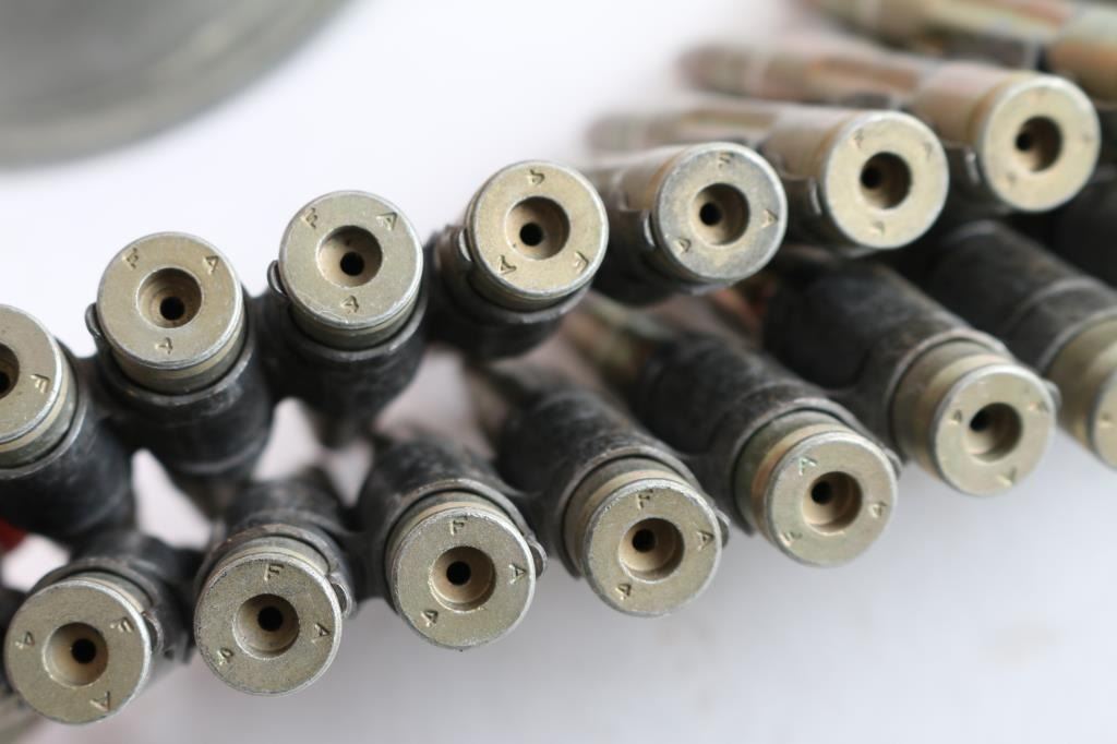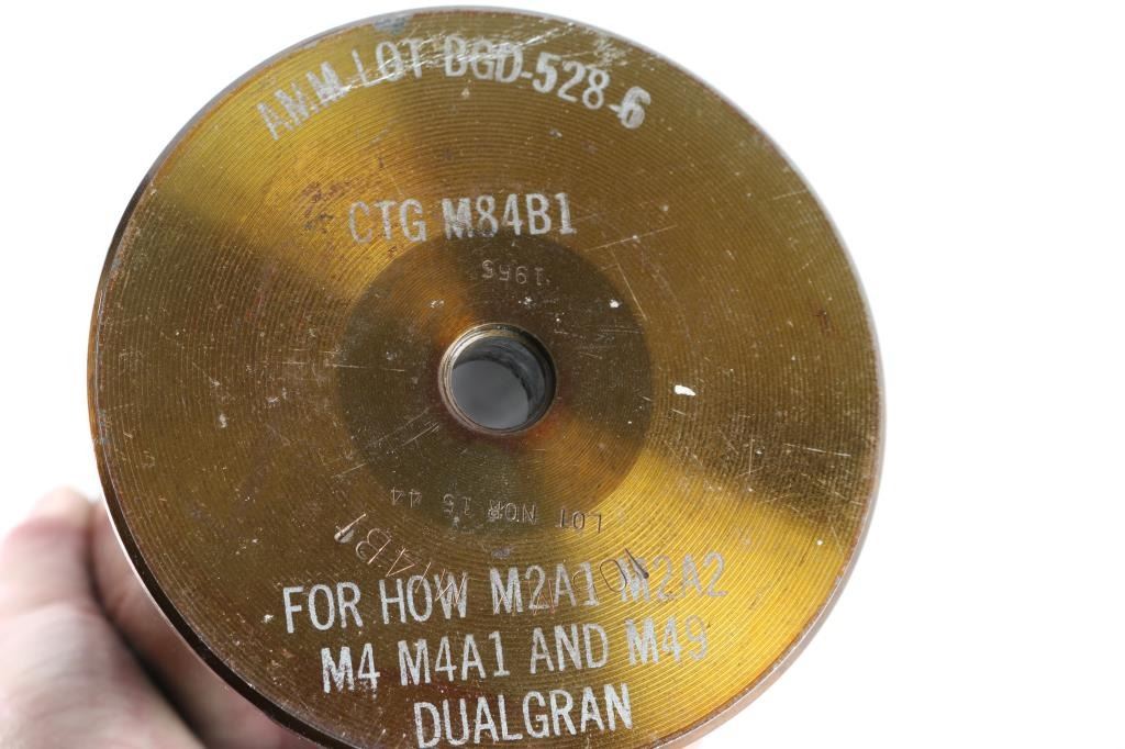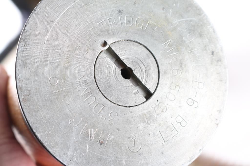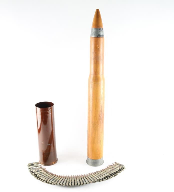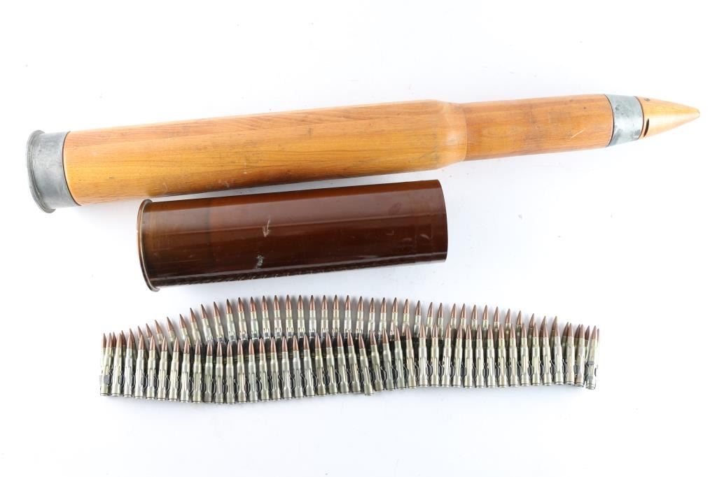 includes a very good condition USN wooden training shell (appears to be for 3" guns), empty casing for US 105mm Howitzers, and a belt of 30-06 dummy rounds (creased case type).