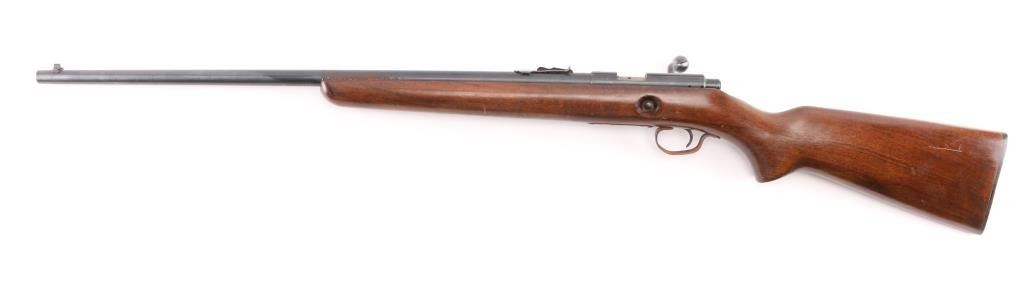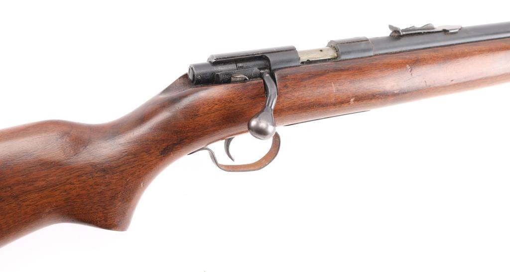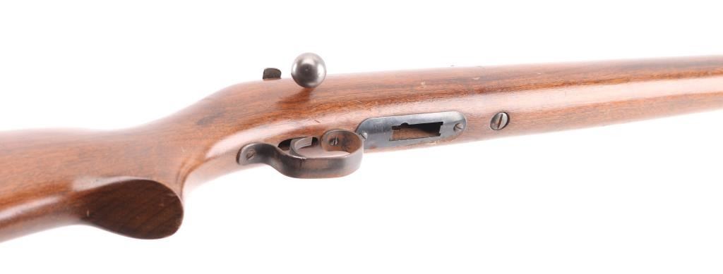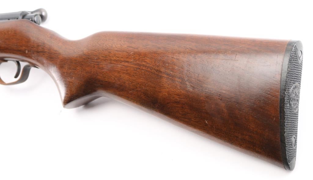 Bolt action rimfire rifle (1935-63) features blued finish, smooth wood stock with curved grip, checkered factory plastic buttplate, 25" barrel, post/bead front sight, elevation adjustable rear sight, detachable magazine with release button in side of stock, manual safety. Bore appears very good/bright. Blued finish is about 80% with a 3" area of rust on the left barrel above the forearm, magazine plate & triggerguard are also rusted. Stock is very good with few dents & dings. No magazine. May improve with cleaning. NRA Condition-Fair/Rust. C&R Firearm.