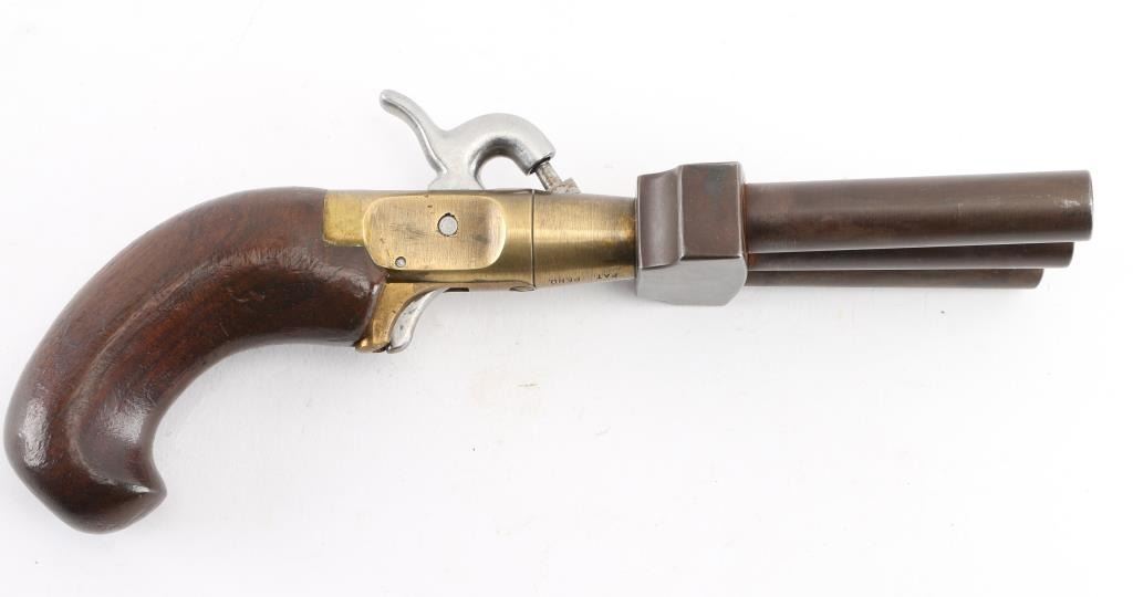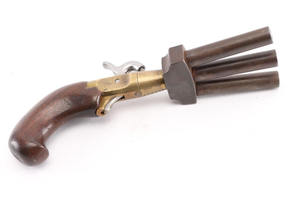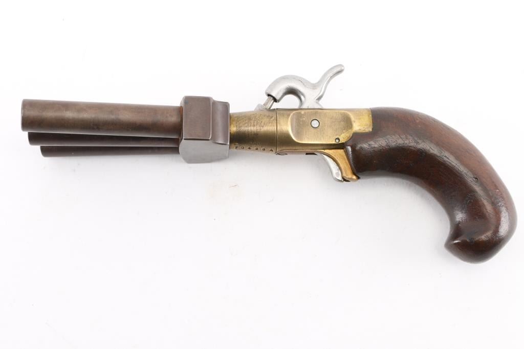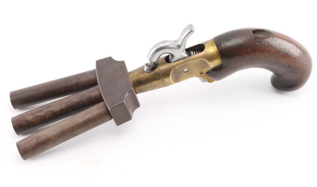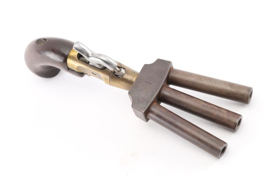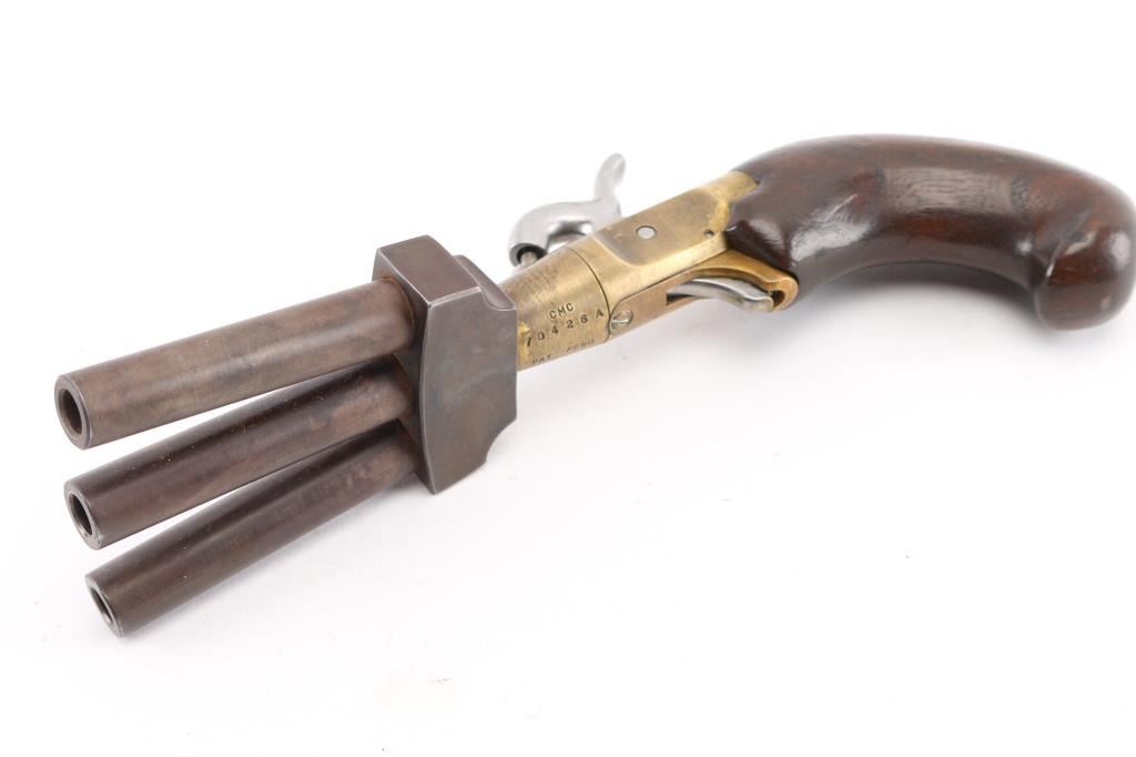 This is a CMC reproduction percussion Duck Foot pistol. Its a black powder pistol with three barrels. It was sold as a kit in the 1960's, 70's. It fires a .36 cal lead ball. It has a full cock on the hammer. No trigger guard. It uses standard sized caps. It was a naval weapon and was used for boarding other vessels. It was also used as defense from mutinies. Gun is in working order. Wood , steel and Brass. Bores look good. NRA Condition-Very Good. Antique Firearm.